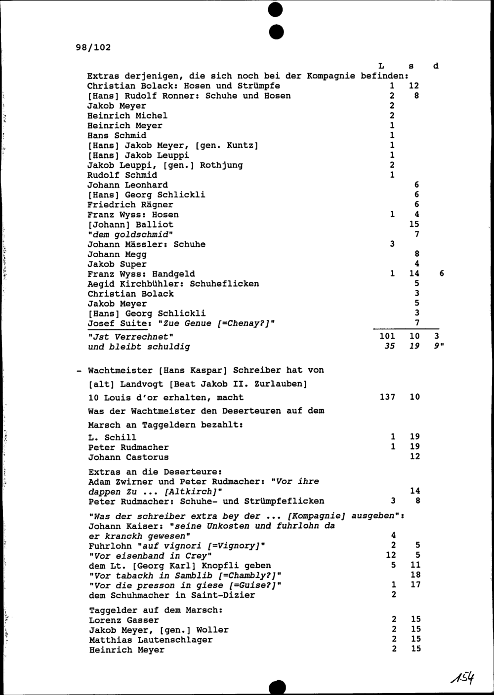 Ausgaben für die Kompanie von Beat Jakob II. Zurlauben, Hauptmann im Regiment Pfyffer, von Hüningen bis Vallenciennes