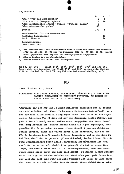 Schreiben von Hans Kaspar Schreiber, Fähnrich in der Kompanie Zurlauben im Regiment...