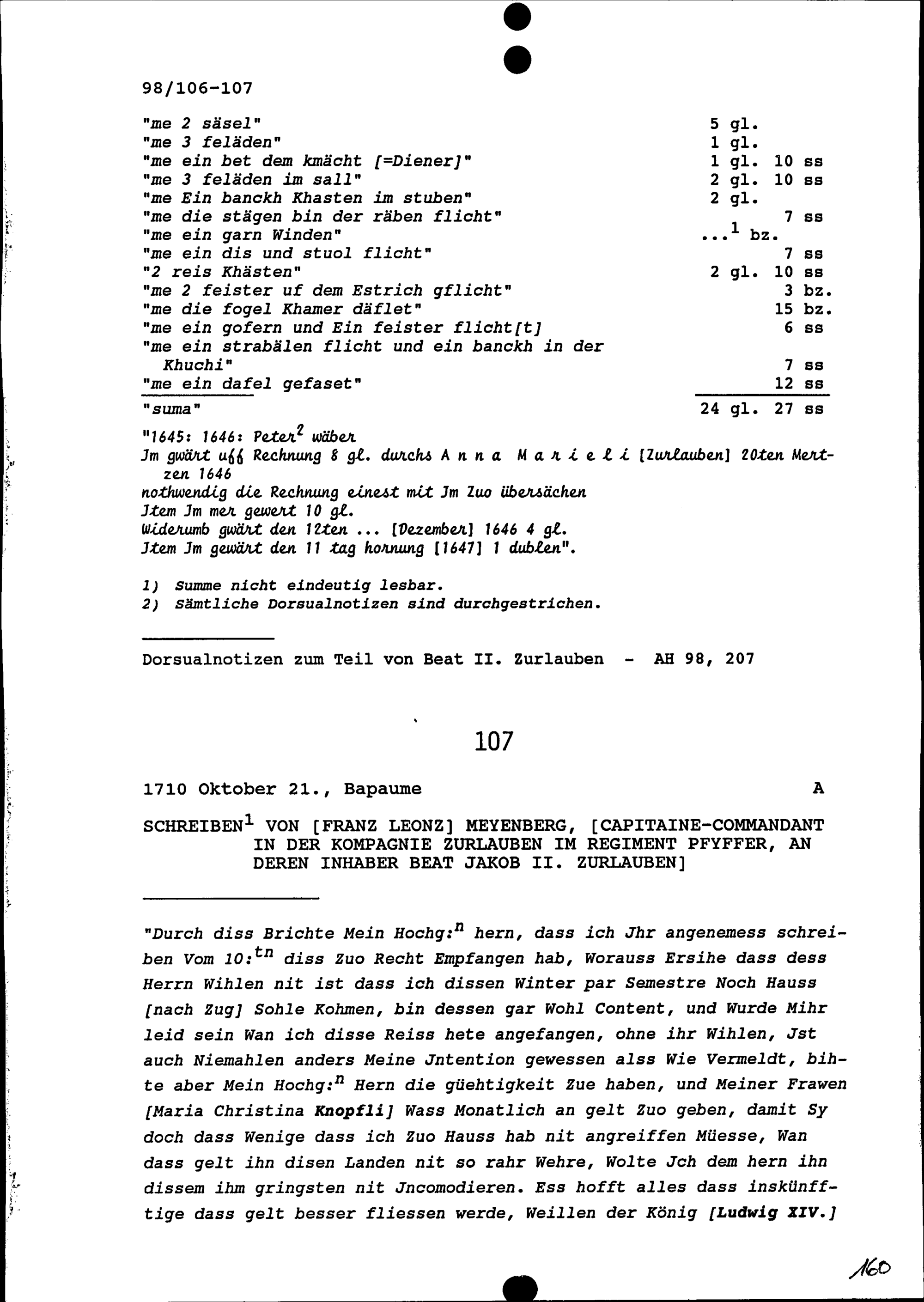 Schreiben von Franz Leonz Meyenberg, Kommandant in der Kompanie Zurlauben im Regiment Pfyffer, an Beat Jakob II. Zurlauben, Kompanieinhaber
