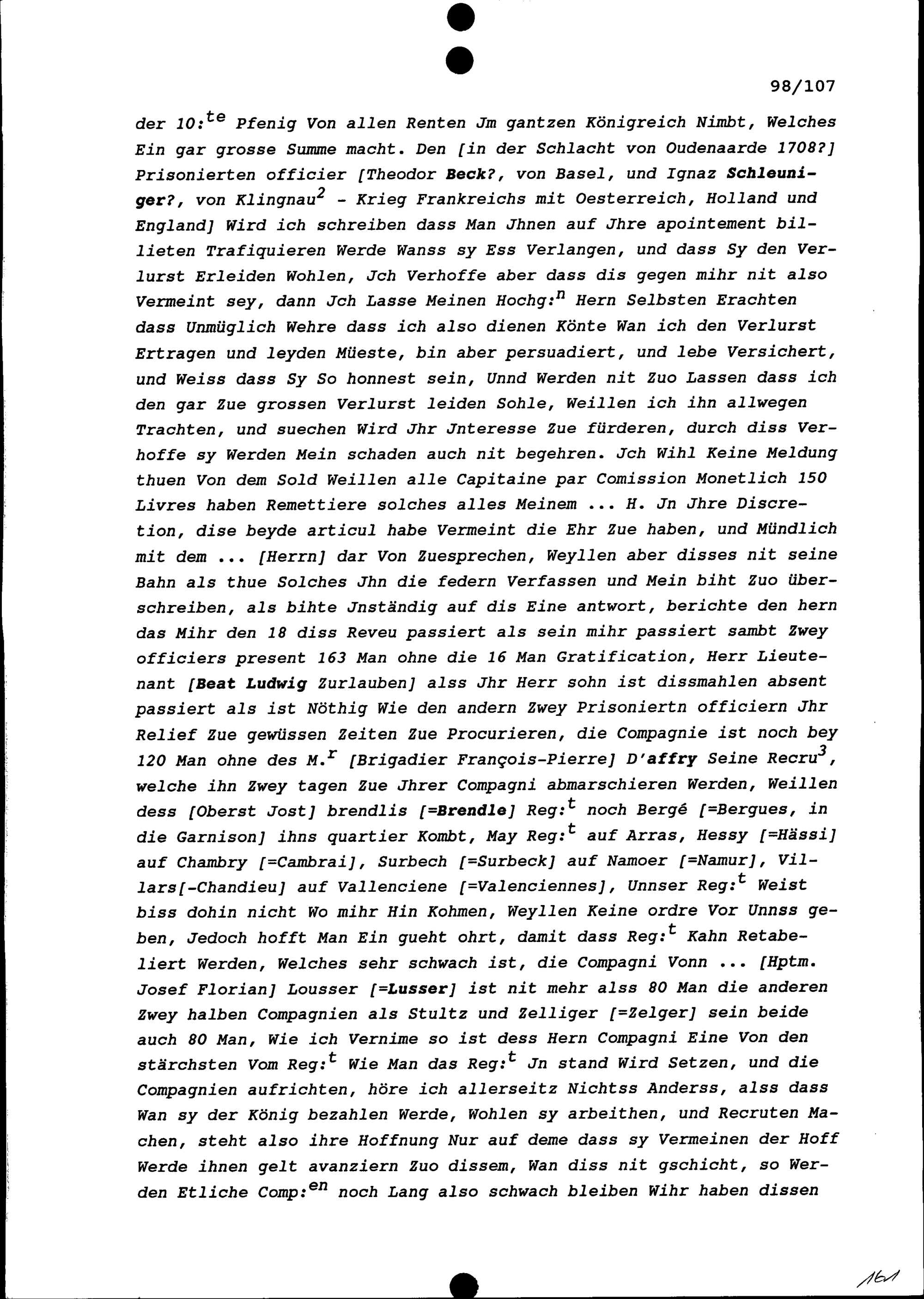 Schreiben von Franz Leonz Meyenberg, Kommandant in der Kompanie Zurlauben im Regiment Pfyffer, an Beat Jakob II. Zurlauben, Kompanieinhaber