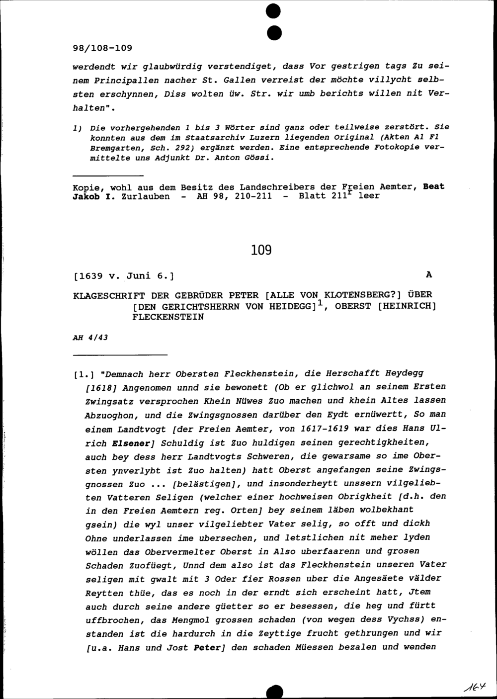 Klageschrift der Gebrüder Peter alle von Klotensberg über Heinrich Fleckenstein, Gerichtsherr von Heidegg und Oberst