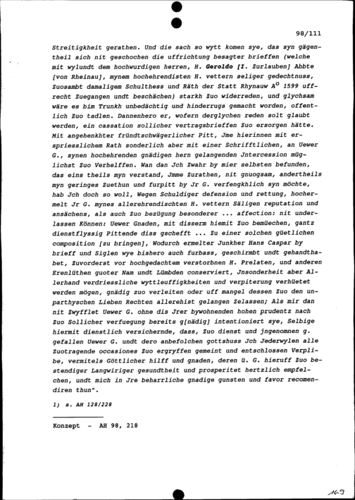 Schreiben von Beat II. Zurlauben, Stadt- und Amtrat, an Eberhard III. von Bernhausen, Abt von Rheinau