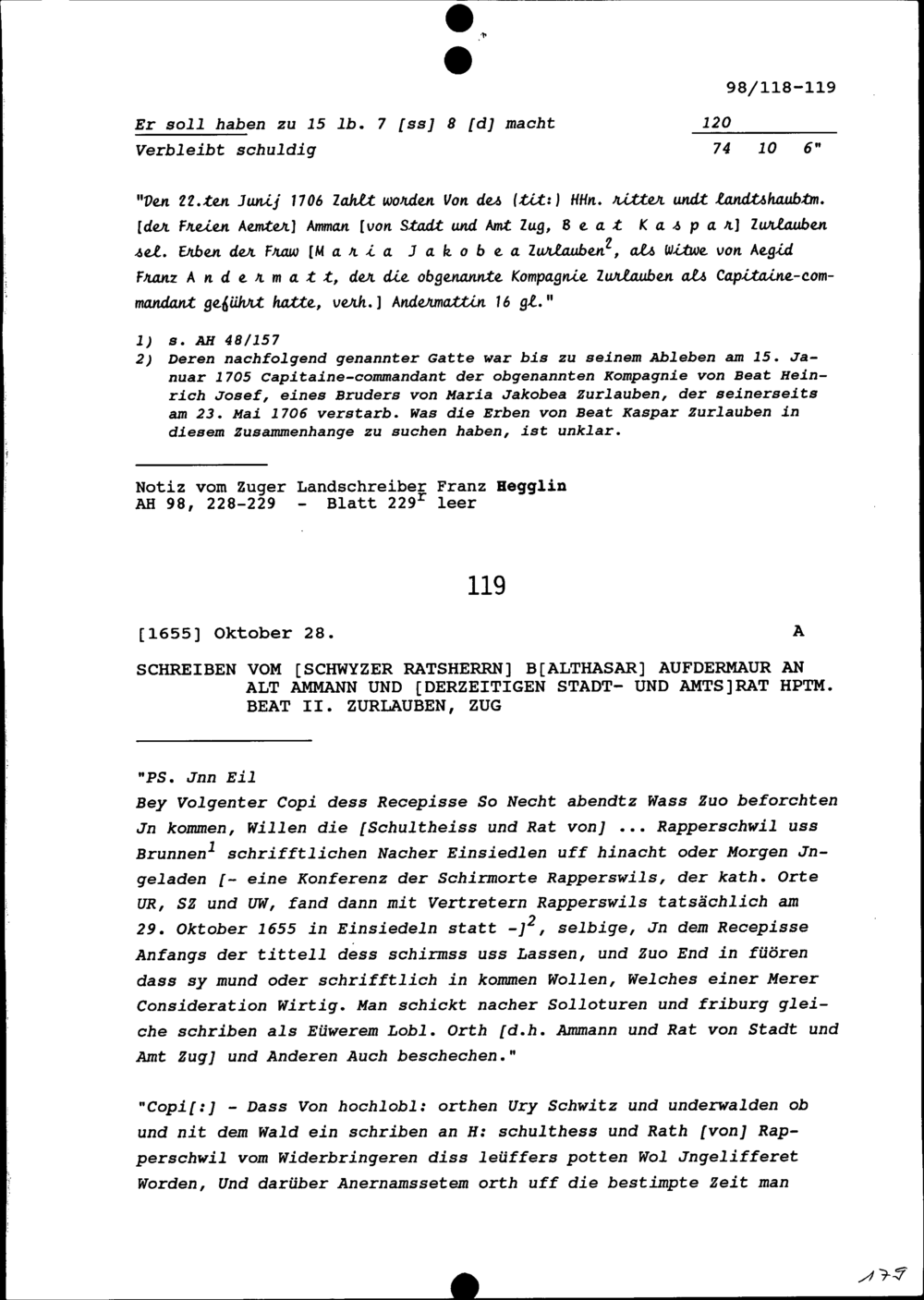 Schreiben von Balthasar Aufdermaur, Ratsherr Schwyz, an Beat II. Zurlauben, Hauptmann...