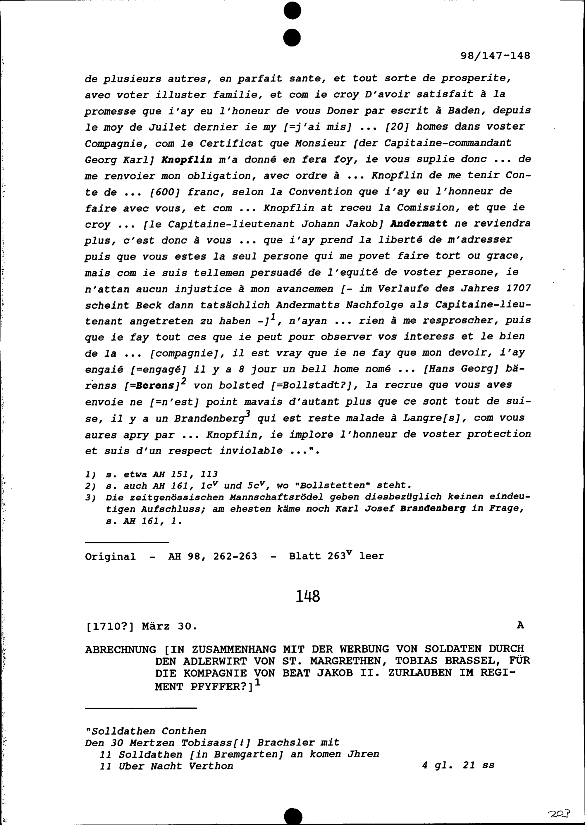 Abrechnung in Zusammenhang mit der Werbung von Soldaten durch Tobias Brassel, Adlerwirt von Sankt Margrethen, für die Kompanie von Beat Jakob II. Zurlauben im Regiment Pfyffer