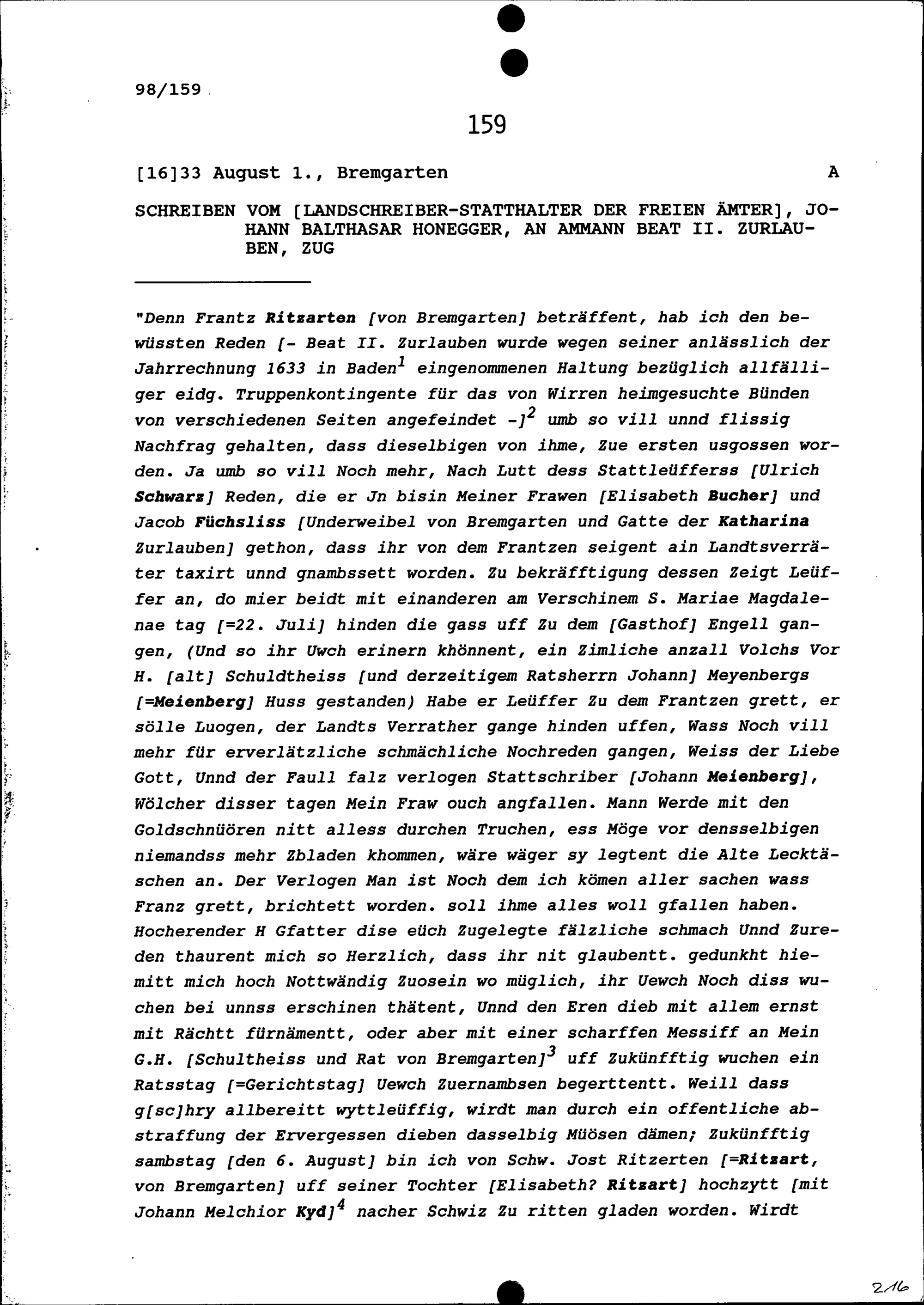 Schreiben von Johann Balthasar Honegger, Landschreiberstatthalter der Freien Ämter, an Beat II. Zurlauben, Ammann, Zug