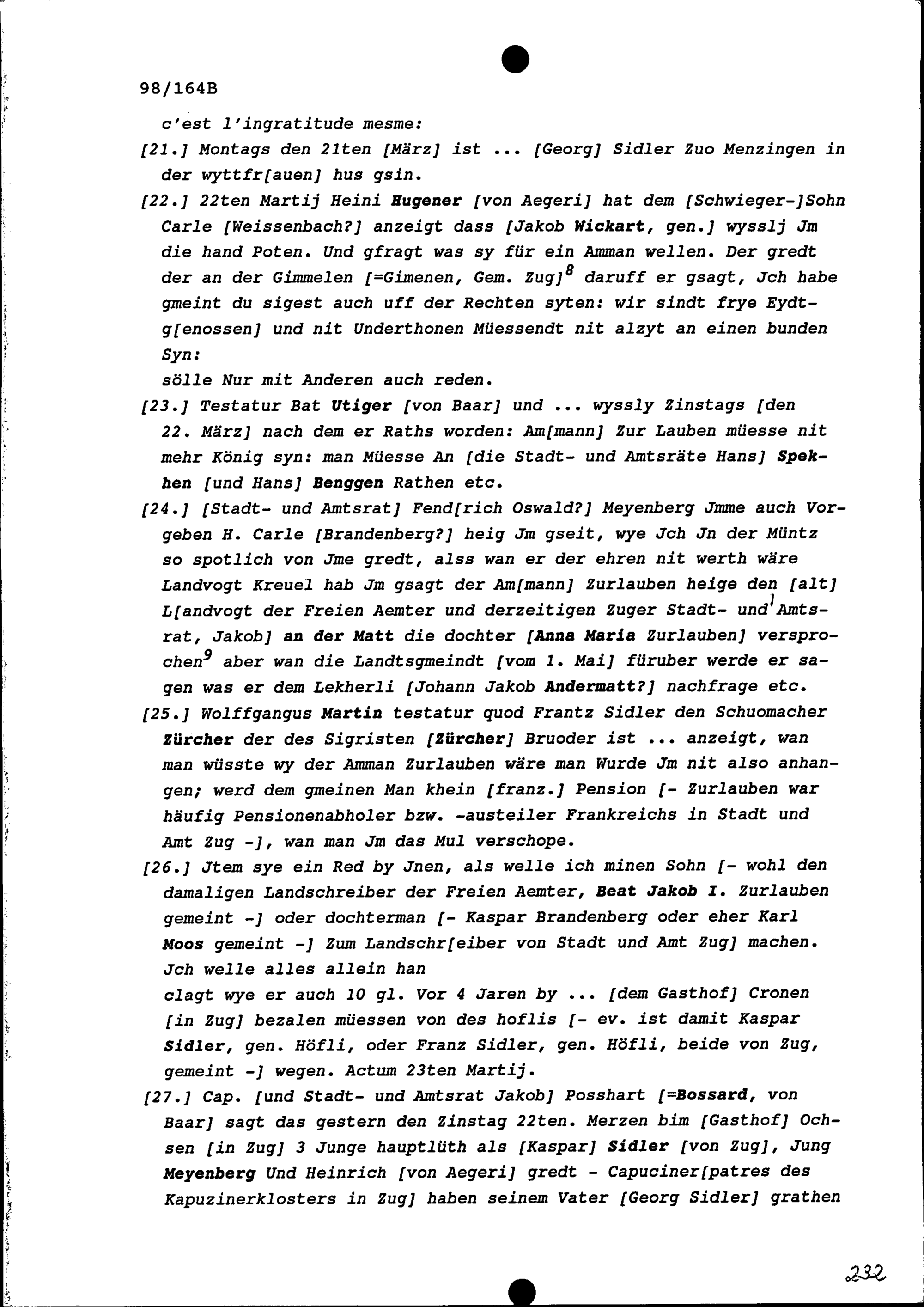 Notiz von Beat II. Zurlauben, Stadt- und Amtrat Zug