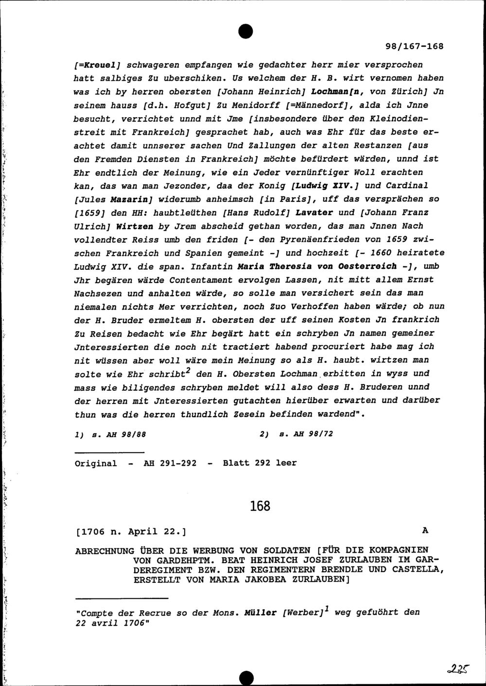 Abrechnung über die Werbung von Soldaten für die Kompanien von Beat Heinrich Josef Zurlauben, Gardehauptmann, im Garderegiment beziehungsweise den Regimentern Jost Brendlé und Castella, erstellt von Maria Jakobea Zurlauben