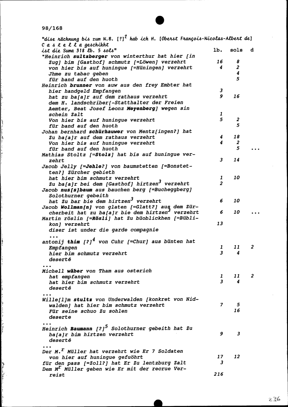 Abrechnung über die Werbung von Soldaten für die Kompanien von Beat Heinrich Josef Zurlauben, Gardehauptmann, im Garderegiment beziehungsweise den Regimentern Jost Brendlé und Castella, erstellt von Maria Jakobea Zurlauben