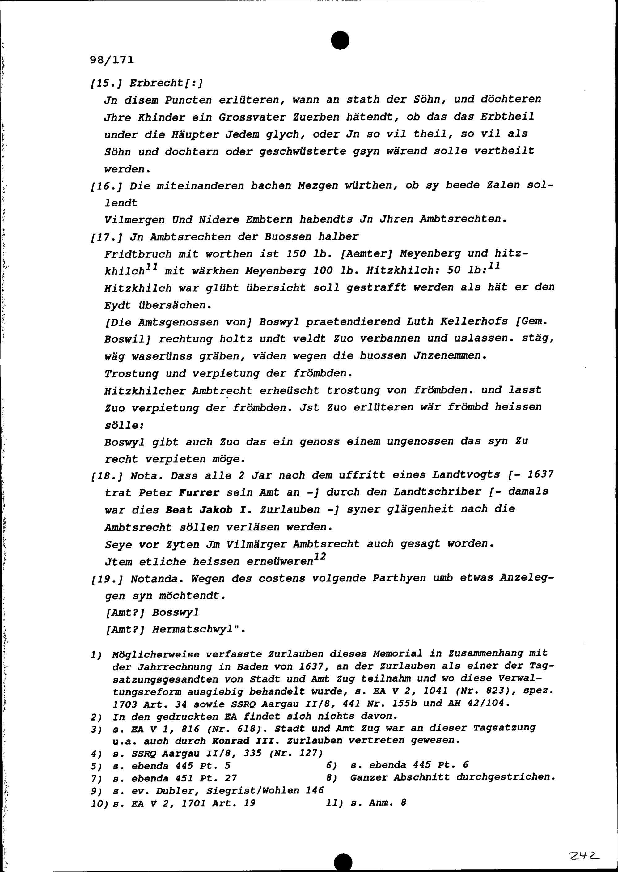 Bericht von Beat II. Zurlauben, Stadt- und Amtrat Zug, in Zusammenhang mit der Verwaltungsreform in den Freien Ämter