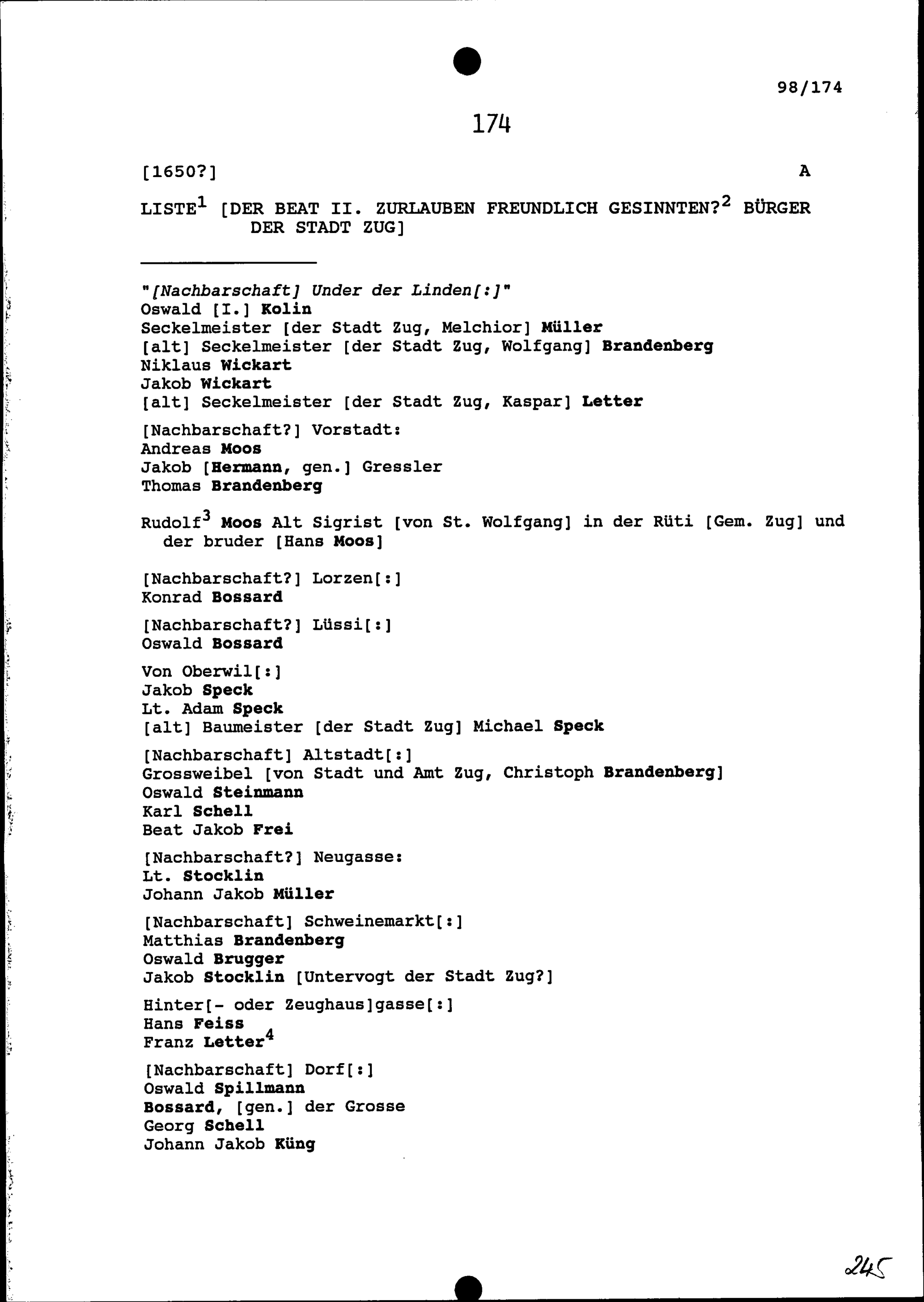Liste der Beat II. Zurlauben freundlich gesinnten Bürger der Stadt Zug