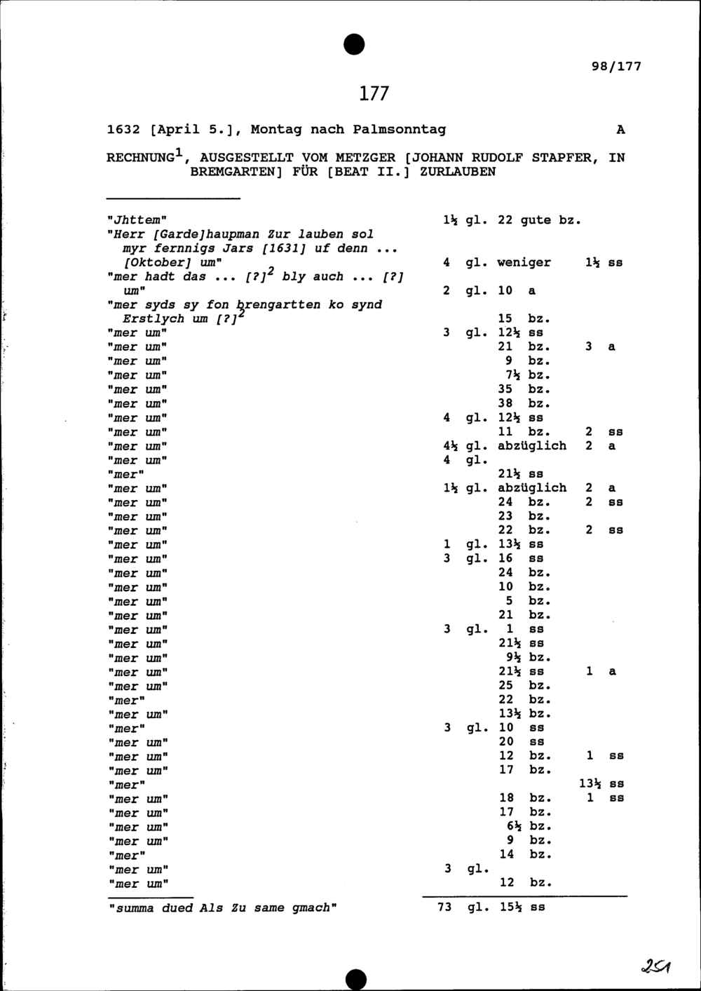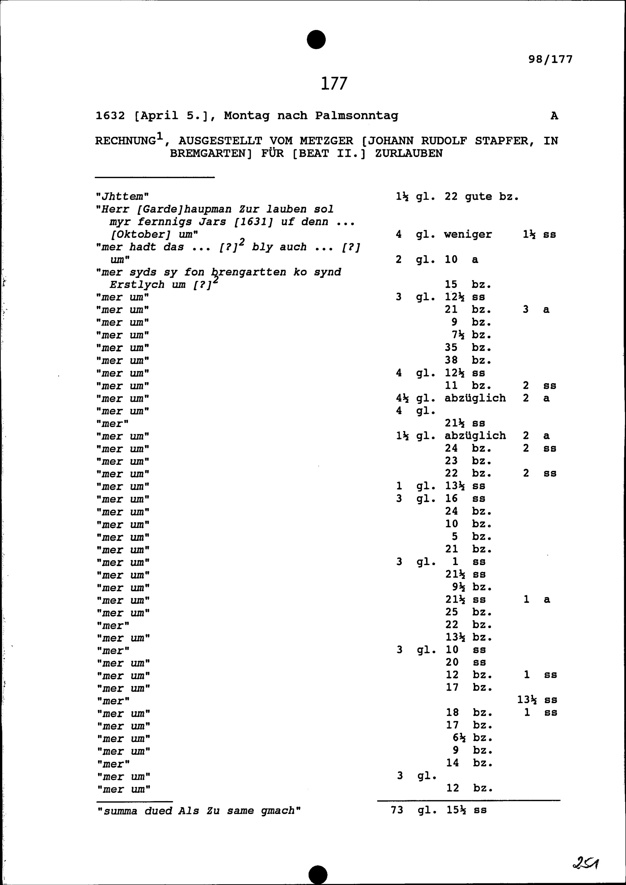 Rechnung für Beat II. Zurlauben, ausgestellt von Johann Rudolf Stapfer, Metzger, Bremgarten