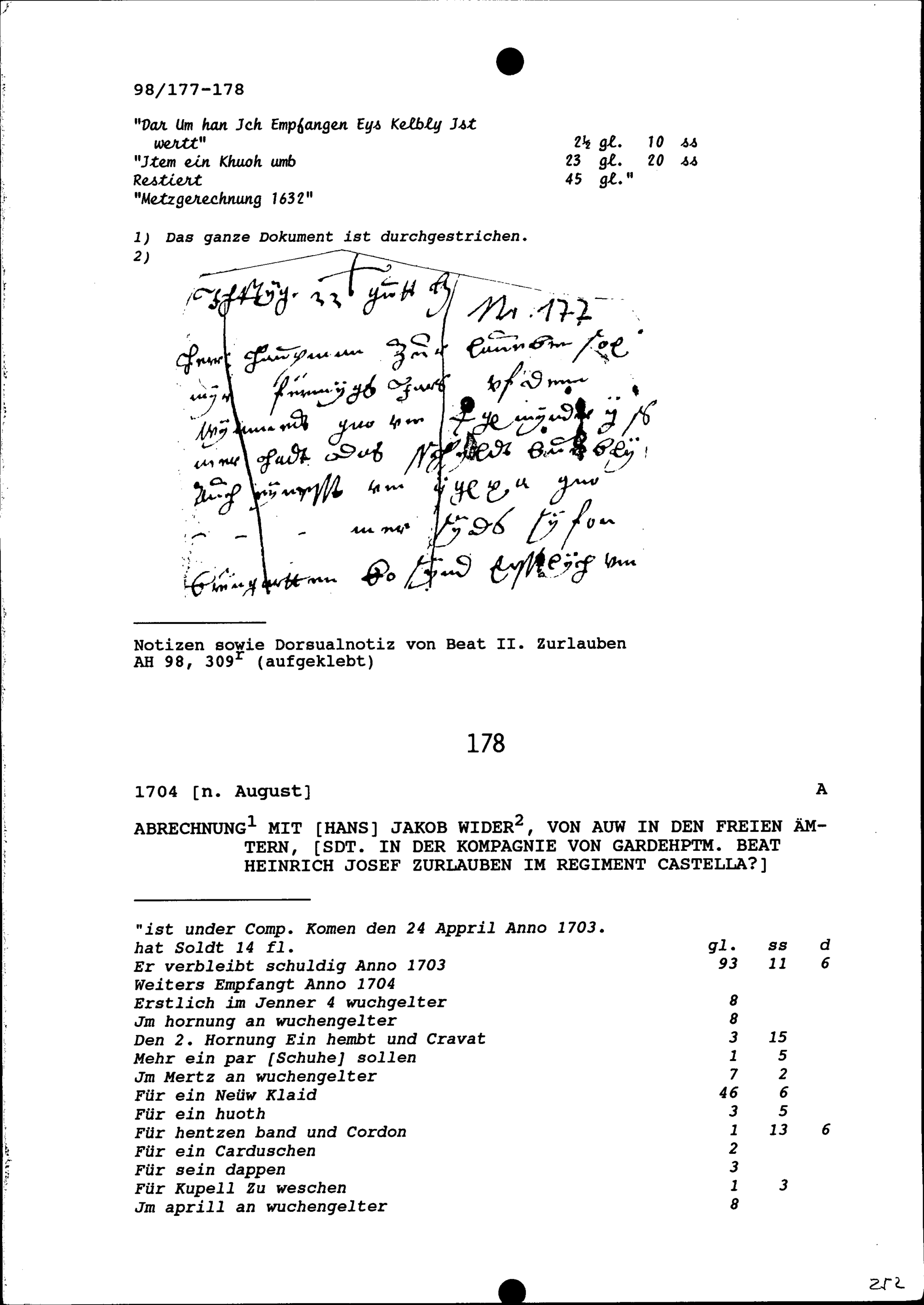 Abrechnung mit Hans Jakob Wider, von Auw in den Freien Ämter, Soldat in der Kompanie von Beat Heinrich Josef Zurlauben, Gardehauptmann