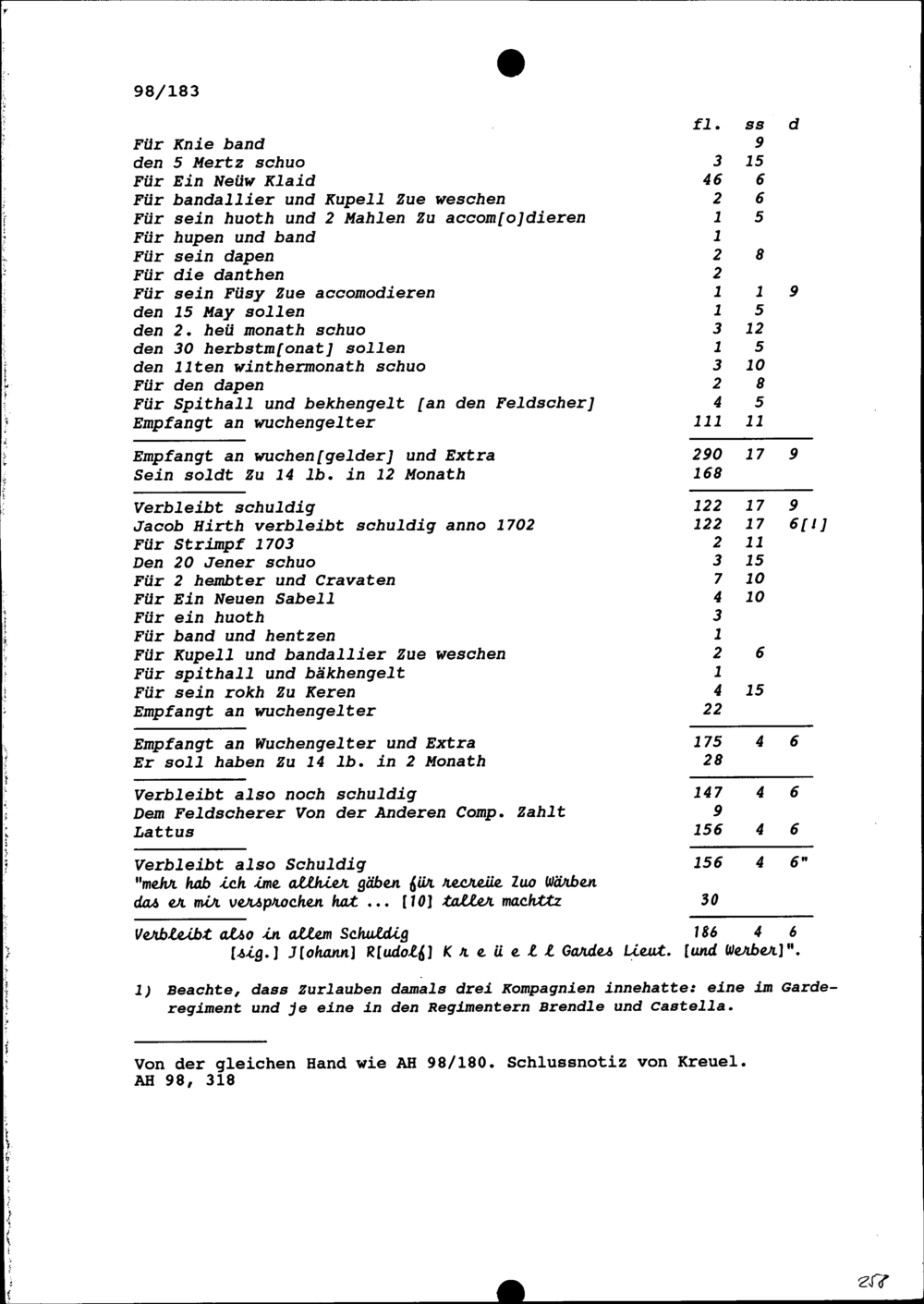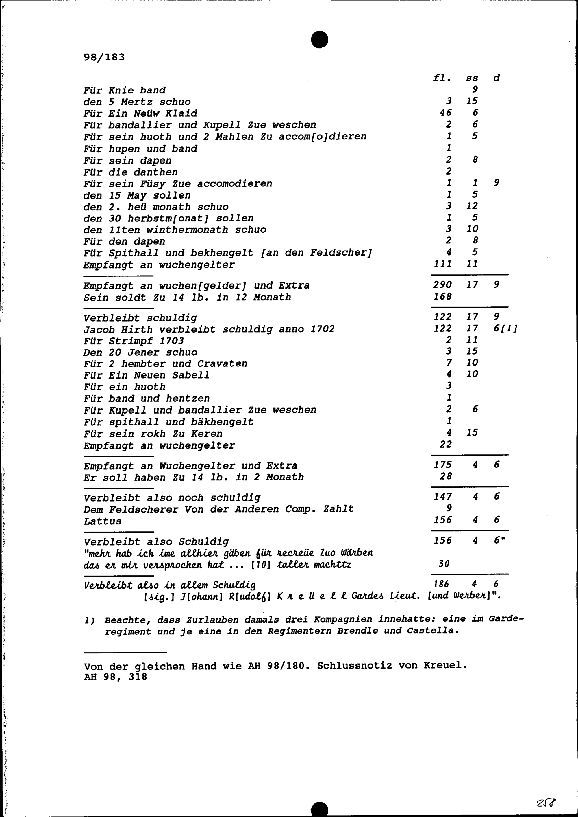 Abrechnung mit Jakob Hirt, Soldat in der Kompanie von Beat Heinrich Josef Zurlauben, Gardehauptmann