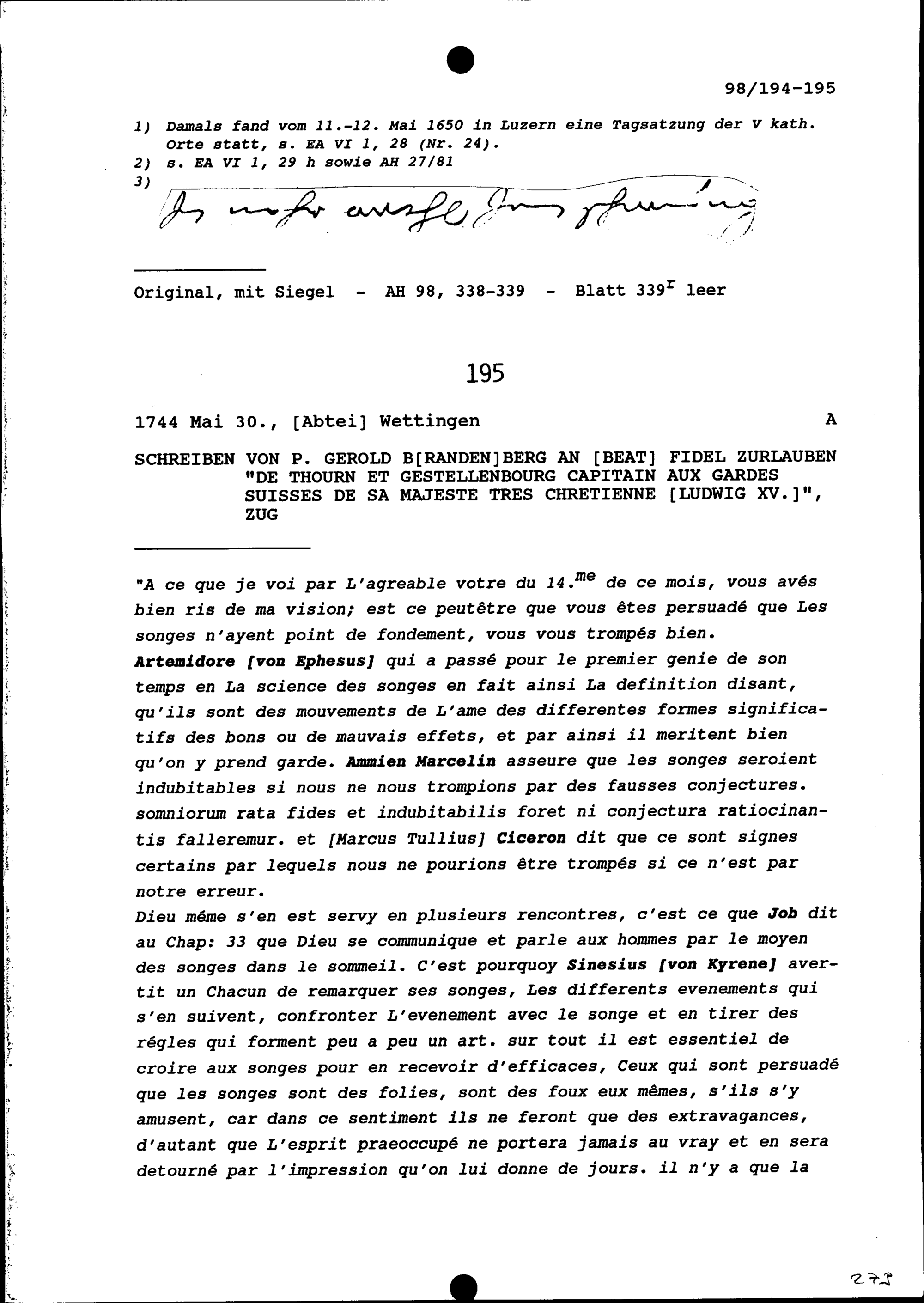 Schreiben von Gerold Brandenberg, Konventuale, an Beat Fidel Zurlauben, Hauptmann, Zug