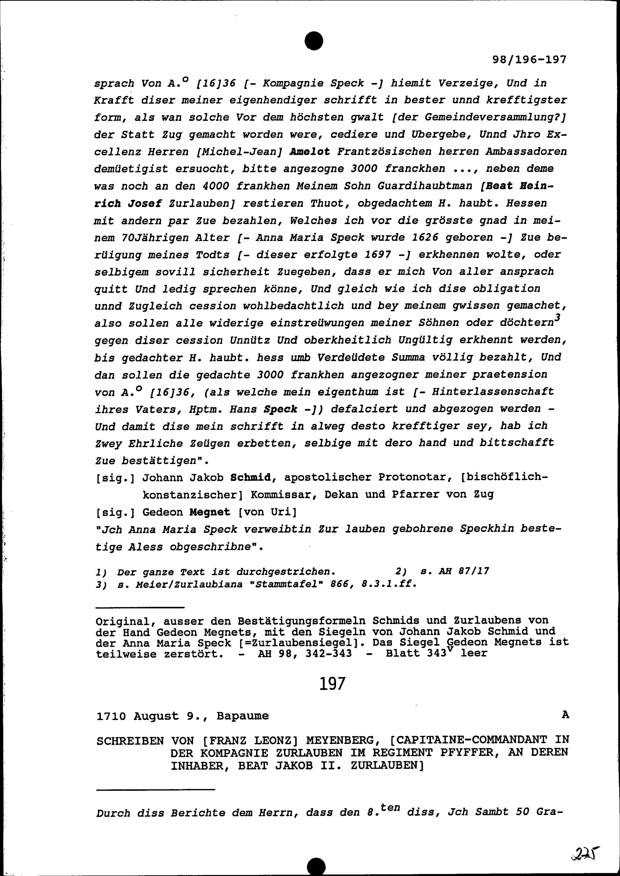 Schreiben von Franz Leonz Meyenberg, Kommandant in der Kompanie Zurlauben im Regiment Pfyffer, an Beat Jakob II. Zurlauben, Kompanieinhaber