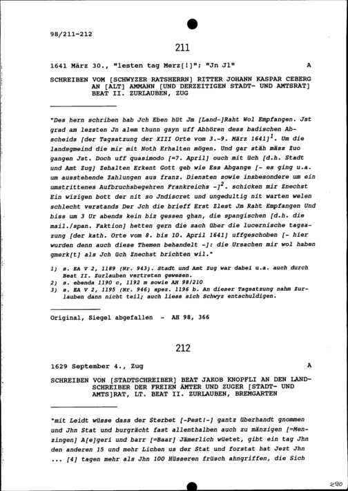Schreiben von Johann Kaspar Ceberg, Ratsherr Schwyz, an Beat II. Zurlauben, Altammann...