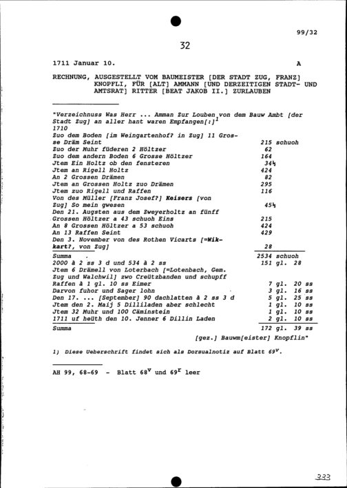 Rechnung für Beat Jakob II. Zurlauben, Altammann und Stadt- und Amtrat, ausgestellt von Franz Knopfli, Baumeister der Stadt Zug