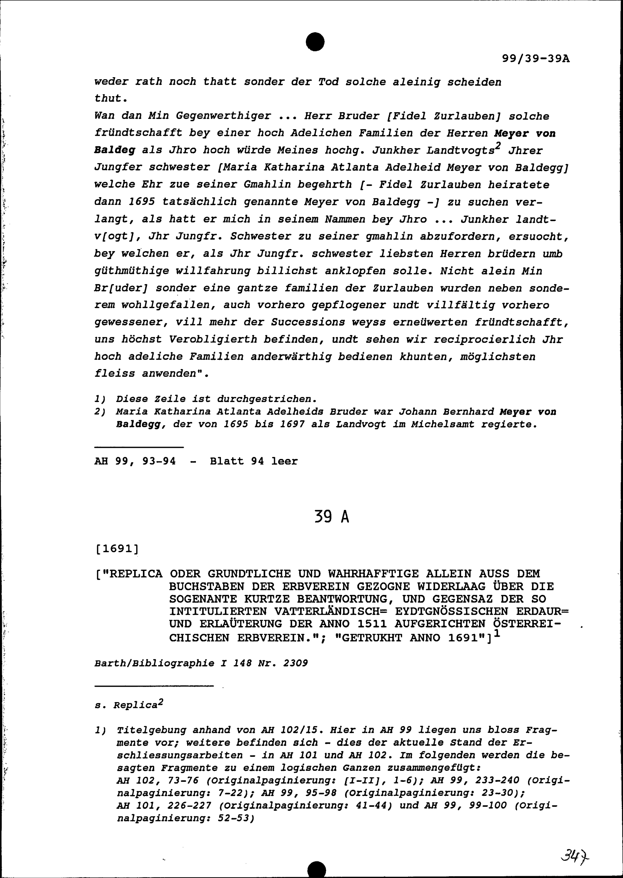 Druck: "Replica, oder gründtliche und warhafftige allein aus dem Buchstaben der Erbverein gezogne Widerlag über die so genandte kurtze Beantwortung und Gegensatz der so intitulierten Vatterländisch-Eydtgnossischen Erdaur- und Erleuterung der Anno 1511. auffgerichten Oesterreichischen Erbverein". 1691
