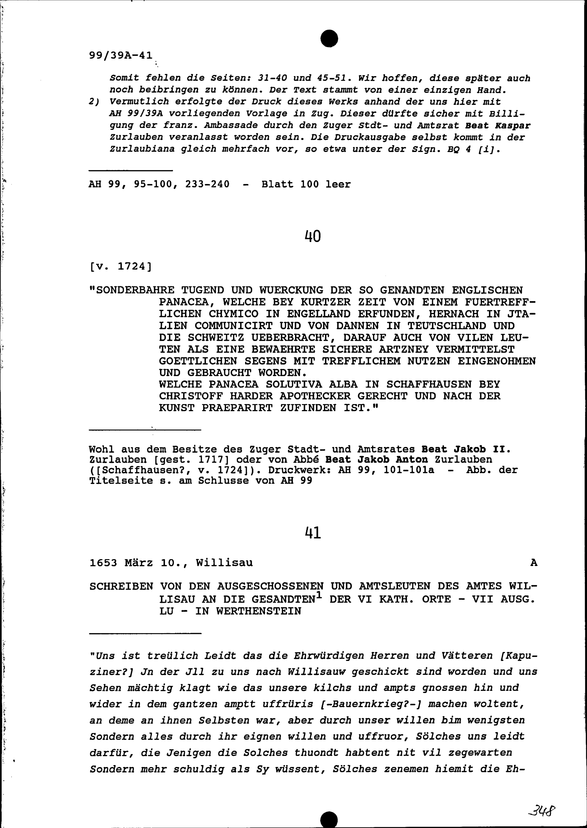 Druck: "Sonderbahre Tugend und Würckung der so genandten englischen Panacea, welche bey einer kurtzen Zeit von einem fürtrefflichen Chymico in Engelland erfunden, hernach in Italien communicirt, und von dannen in Teutschland und die Schweitz überbracht, darauff auch von vielen Leuten, als eine bewährte sichere Artzney, vermittelst göttlichen Segens mit trefflichen Nutzen eingenommen und gebraucht worden." um 1700