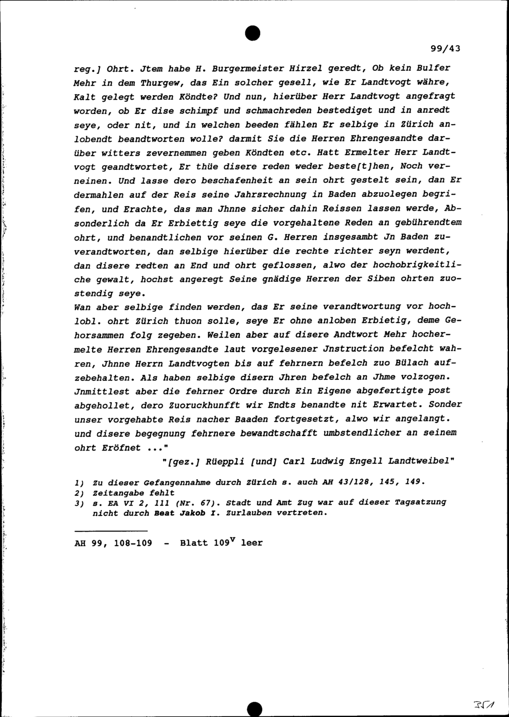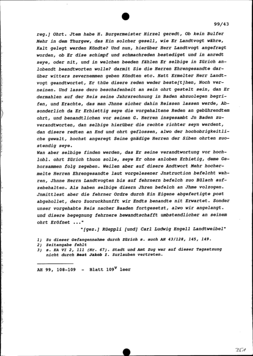 Bericht von Ignaz Josef Rüpplin, Thurgauer Landammann, und von Karl Ludwig Engel, Landweibel, über die Gefangennahme von Josue Iten, Altlandvogt im Thurgau, in Bülach
