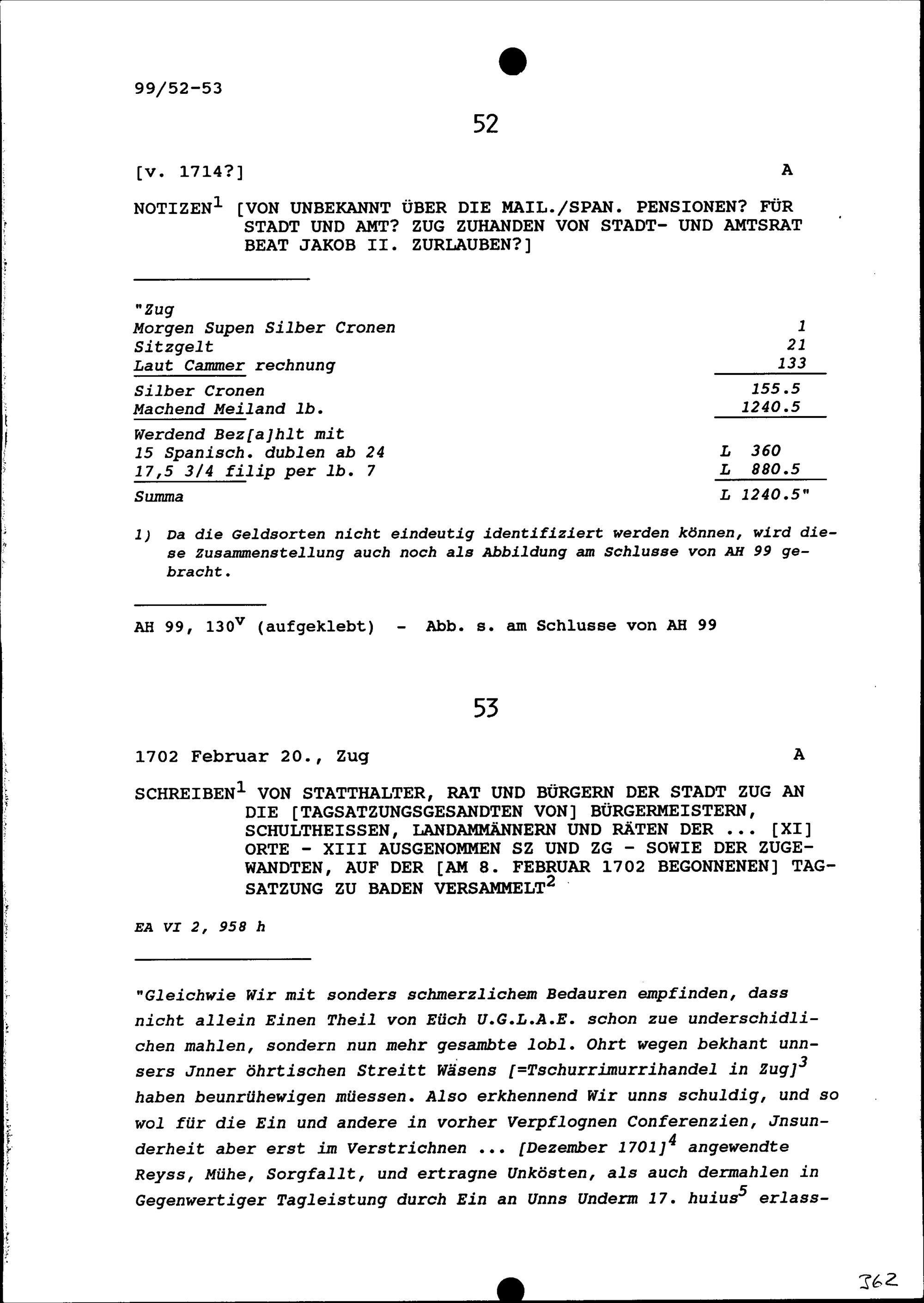 Notiz von Unbekannt über die mailändisch-spanischen Pensionen für Stadt und Amt Zug...