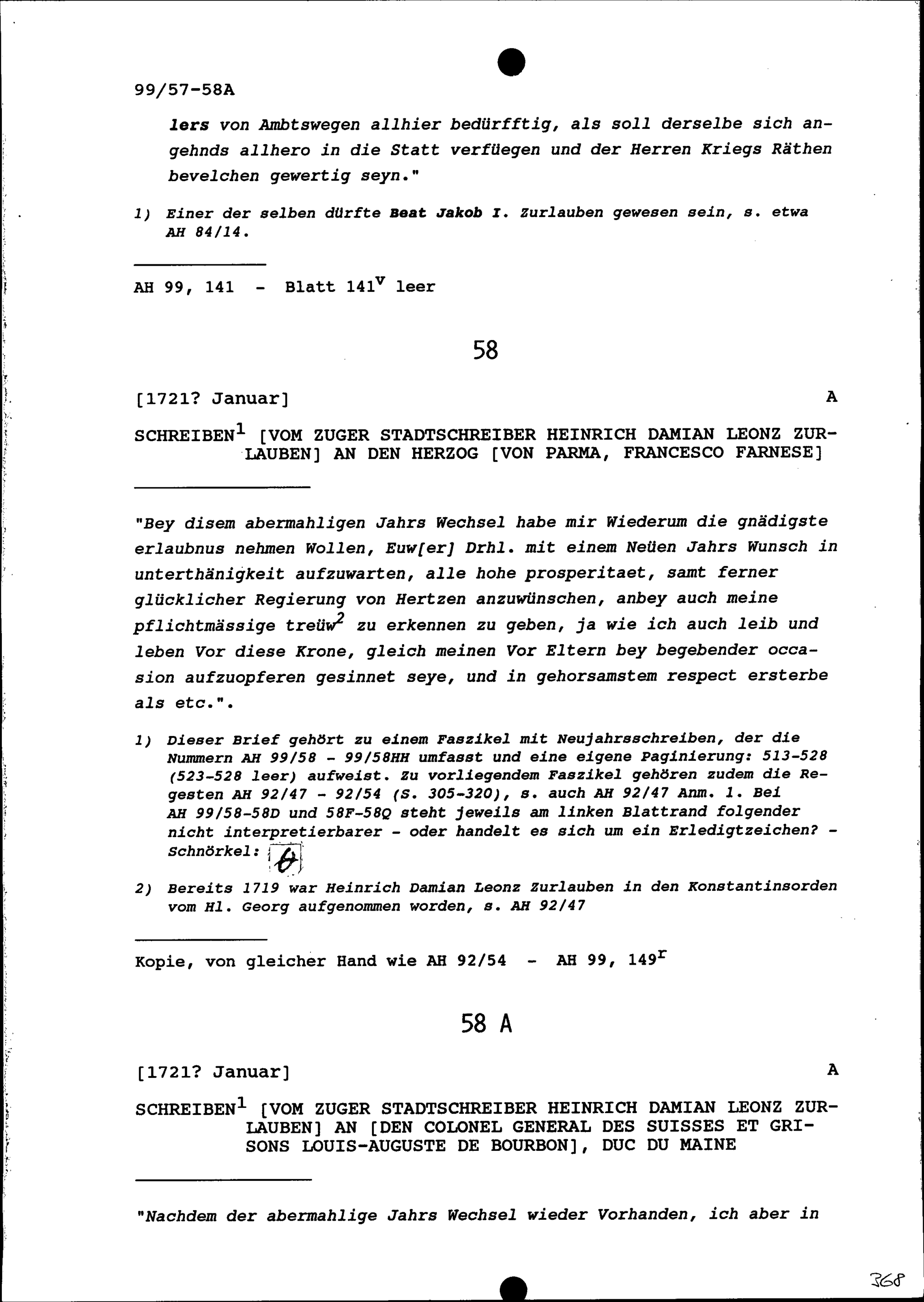 Schreiben von Heinrich Damian Leonz Zurlauben, Zuger Stadtschreiber, an Francesco Farnese, Herzog von Parma
