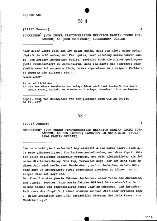 Schreiben von Heinrich Damian Leonz Zurlauben, Zuger Stadtschreiber, an NN Büeler,...