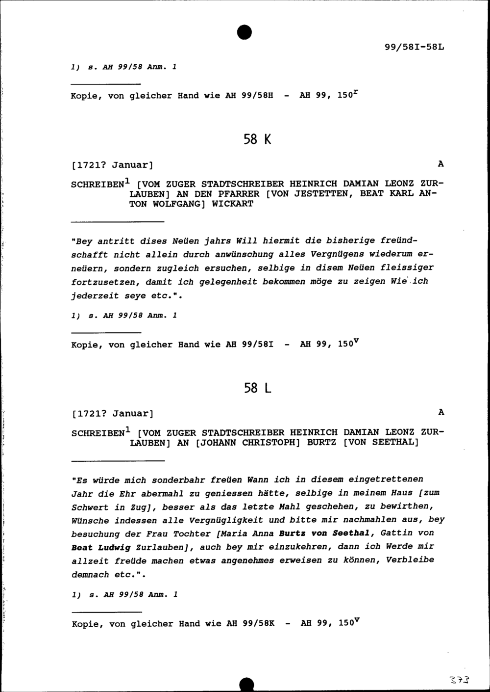 Schreiben von Heinrich Damian Leonz Zurlauben, Zuger Stadtschreiber, an Beat Karl Anton Wolfgang Wickart, Pfarrer von Jestetten