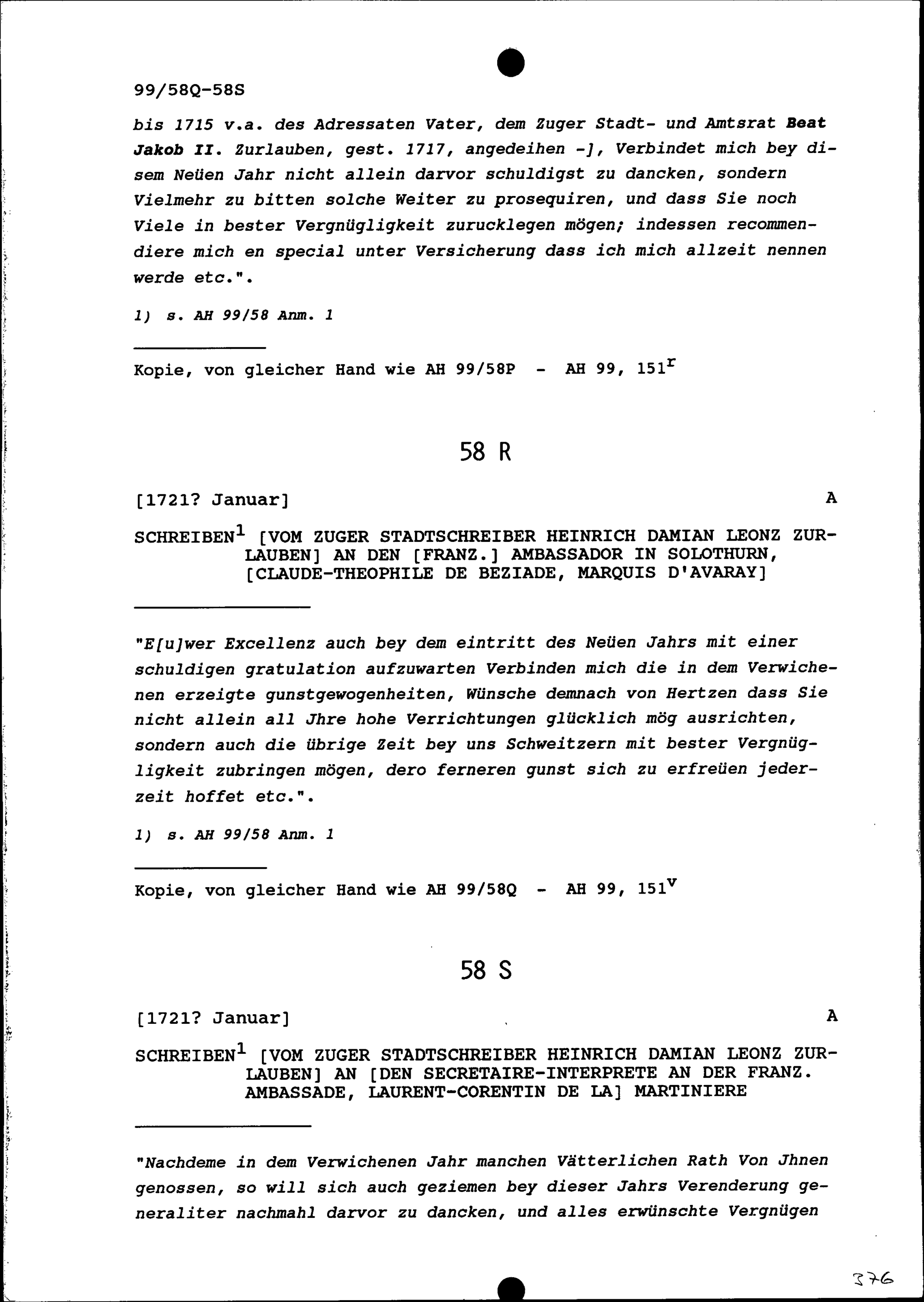 Schreiben von Heinrich Damian Leonz Zurlauben, Zuger Stadtschreiber, an Claude-Théophile de Béziade, Marquis d'Avaray, Ambassador von Frankreich in Solothurn