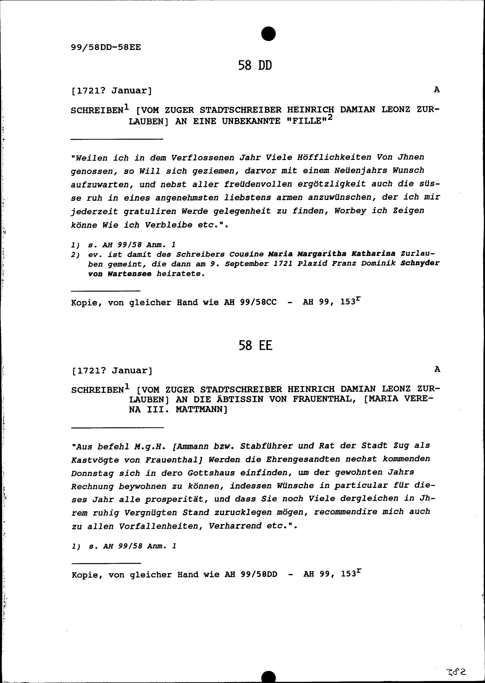 Schreiben von Heinrich Damian Leonz Zurlauben, Zuger Stadtschreiber, an eine Toc...