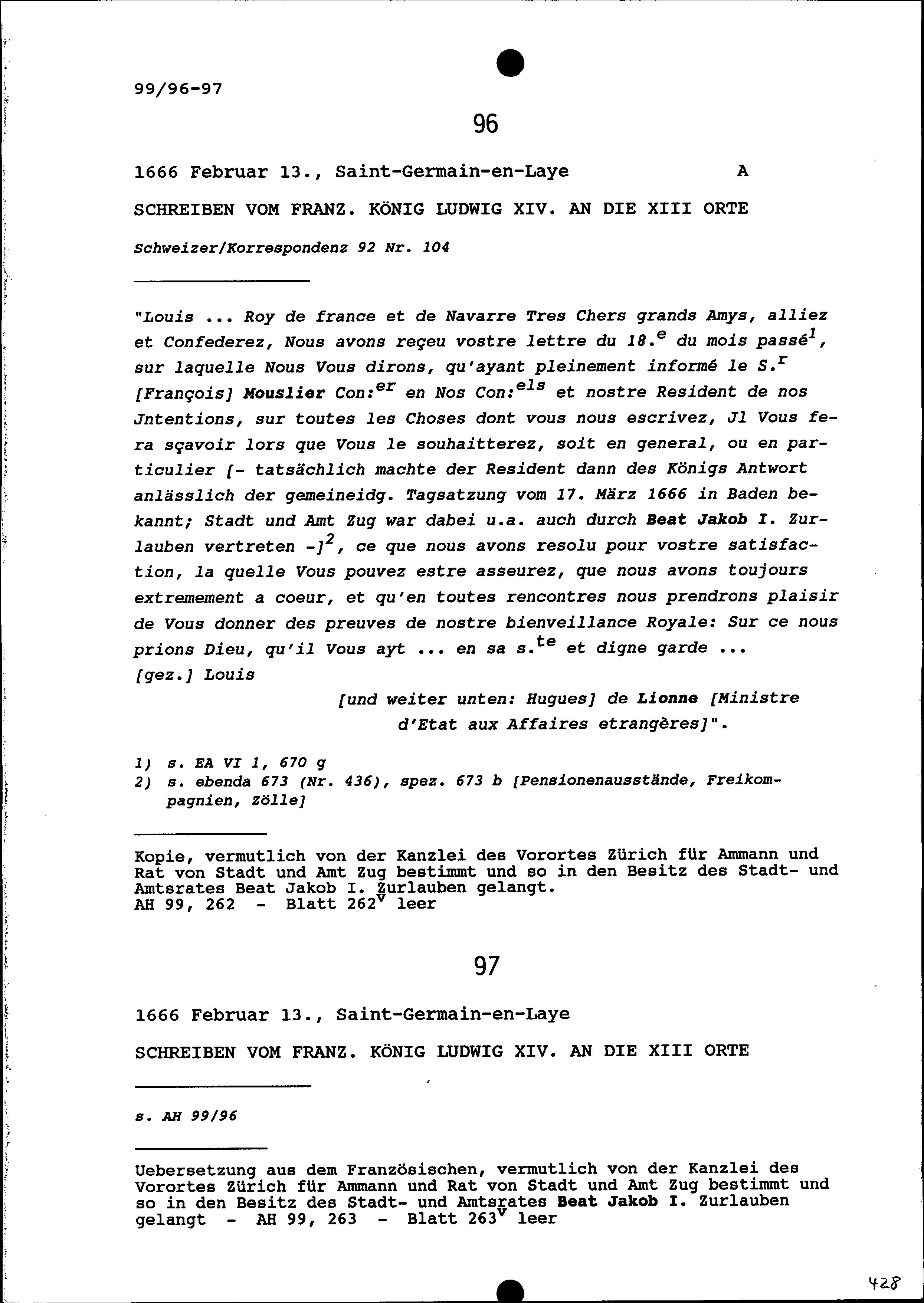 Schreiben von Ludwig XIV., König von Frankreich, an die Dreizehn Orte