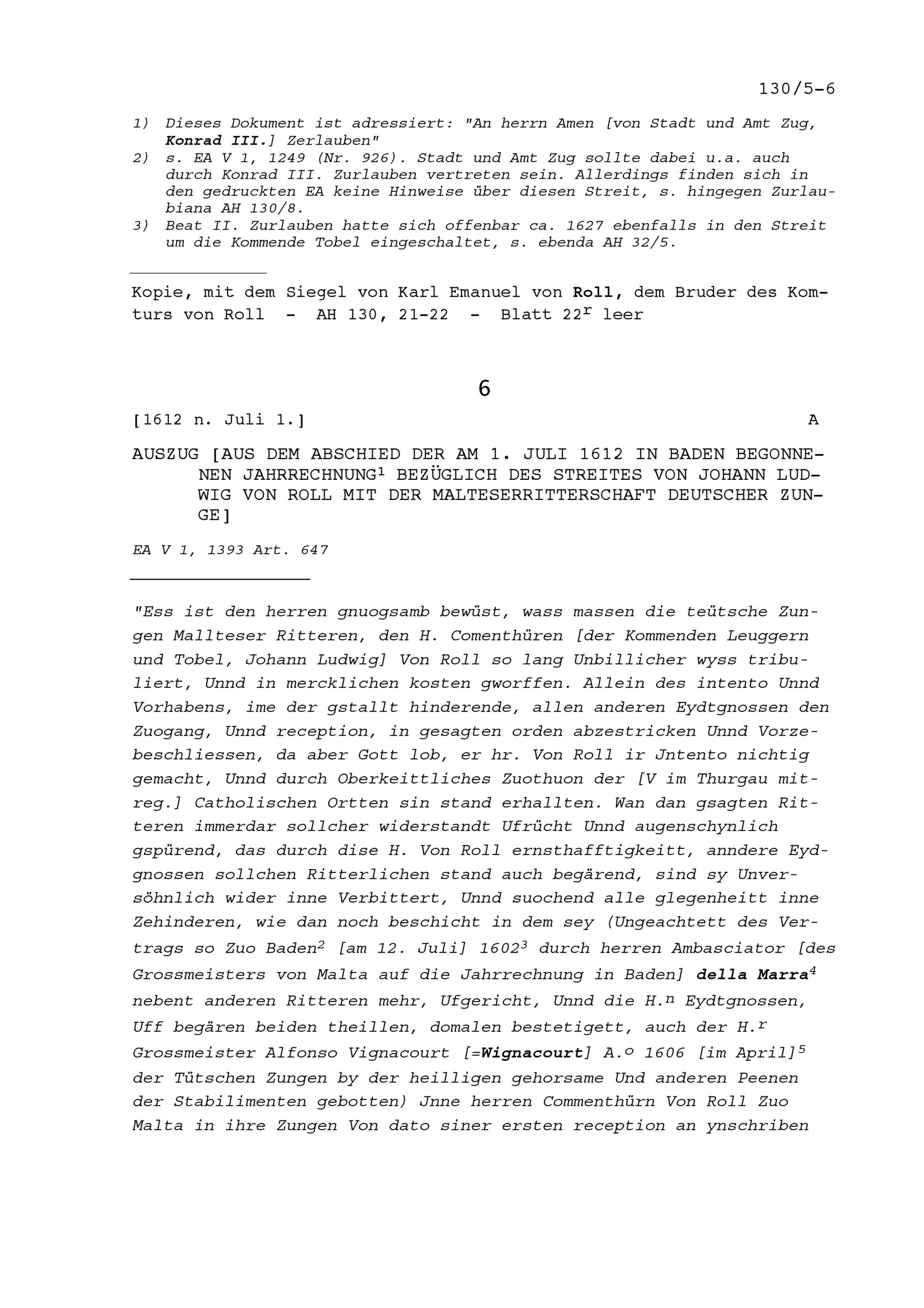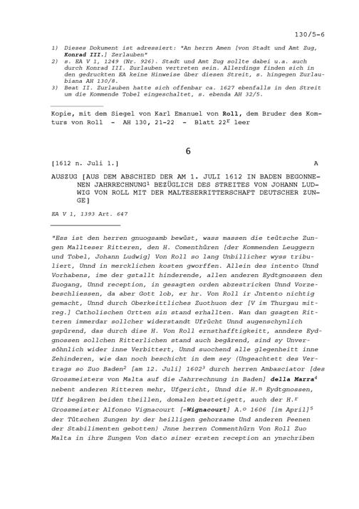 Ortsstimme von Glarus für Johann Ludwig von Roll, Komtur von Leuggern, bezüglich dessen Streits mit der Malteserritterschaft deutscher Zungen