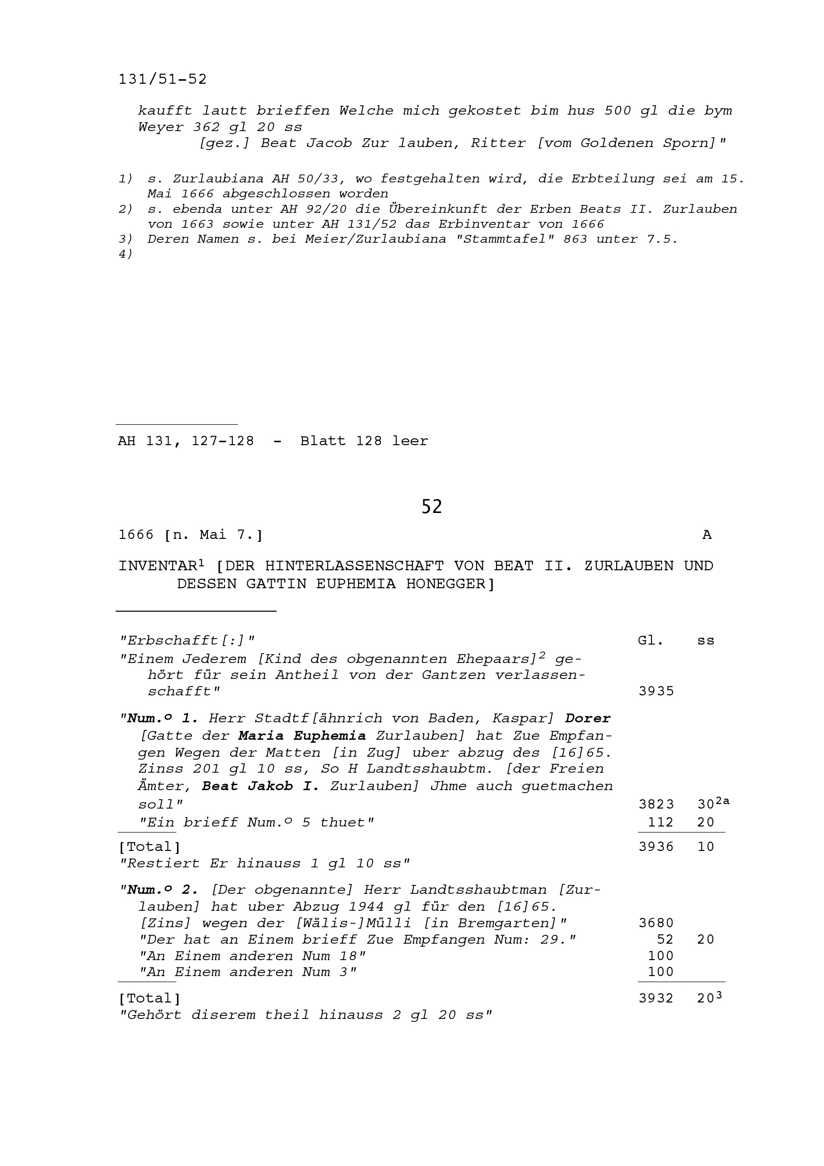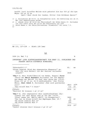 Inventar dessen, was Beat Jakob I. Zurlauben aus der Hinterlassenschaft von Beat II. Zurlauben von Euphemia Honegger, den Eltern, ererbte
