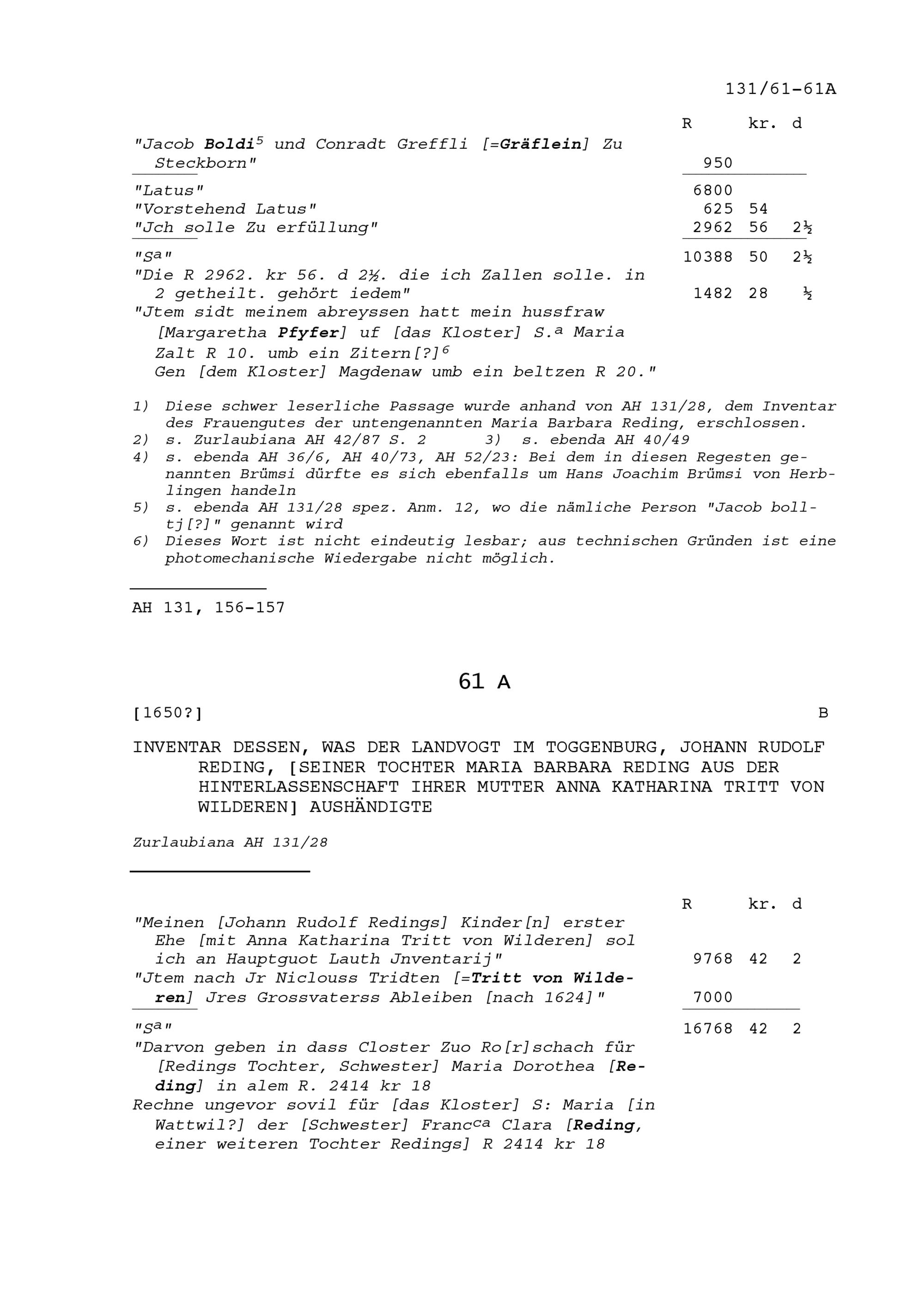 Aufstellung der Erbanteile, auf welche die fünf Kinder von Johann Rudolf Reding, Landvogt im Toggenburg, aus Erster Ehe mit Anna Katharina Tritt von Wilderen Anspruch haben