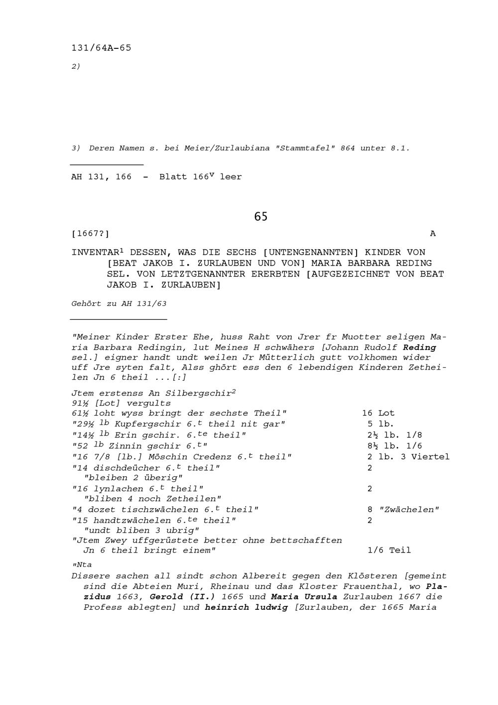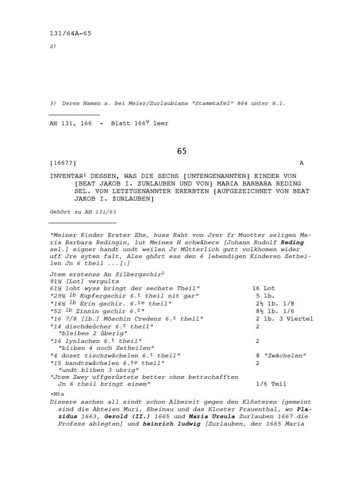 Inventar dessen, was Maria Elisabeth Zurlauben und Anna Maria Zurlauben, welche 1667 als Klosterfrau Maria Ursula im Frauenkloster Frauenthal Profess ablegte, an Schmuck und Kleidern von Maria Barbara Reding, ihrer Mutter, ererbten, aufgezeichnet von Beat Jakob I. Zurlauben