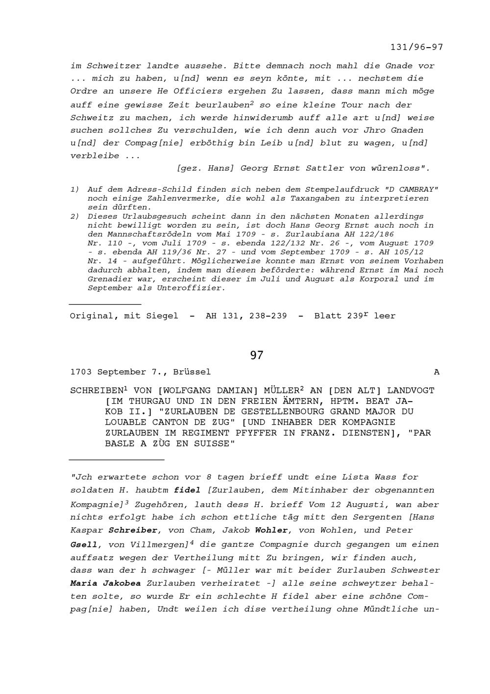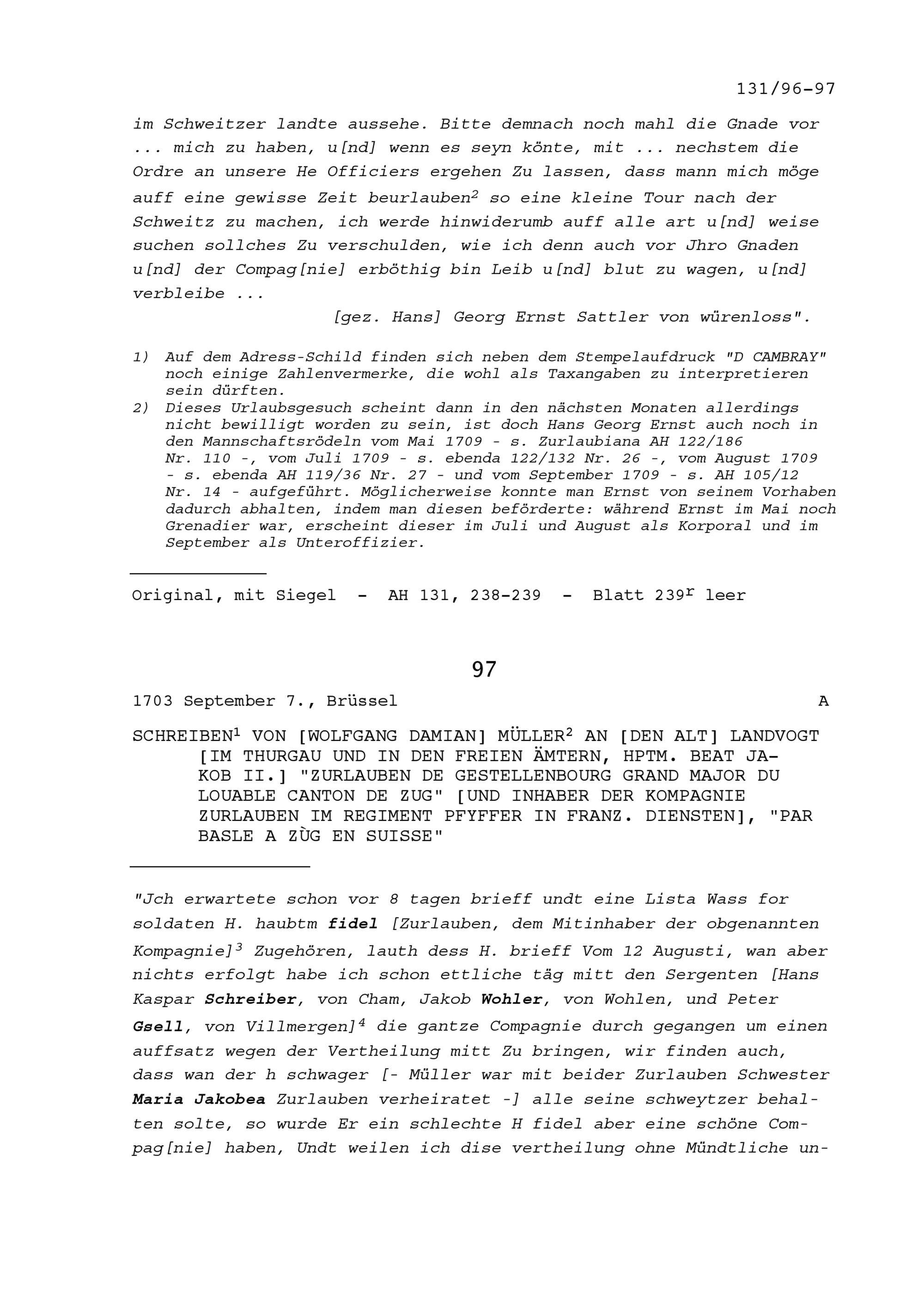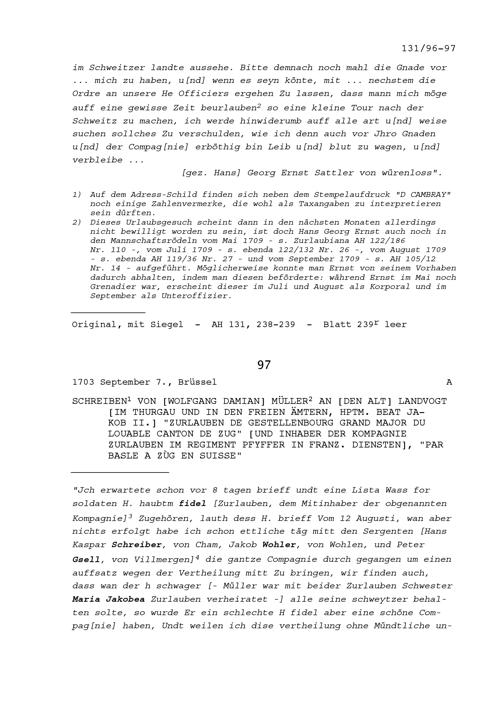 Schreiben von Hans Georg Ernst, Grenadier, an Beat Jakob II. Zurlauben, Major, Ammann von Zug und Stadt- und Amtrat, Inhaber der Kompanie Zurlauben im Regiment Pfyffer in französischen Diensten, Zug