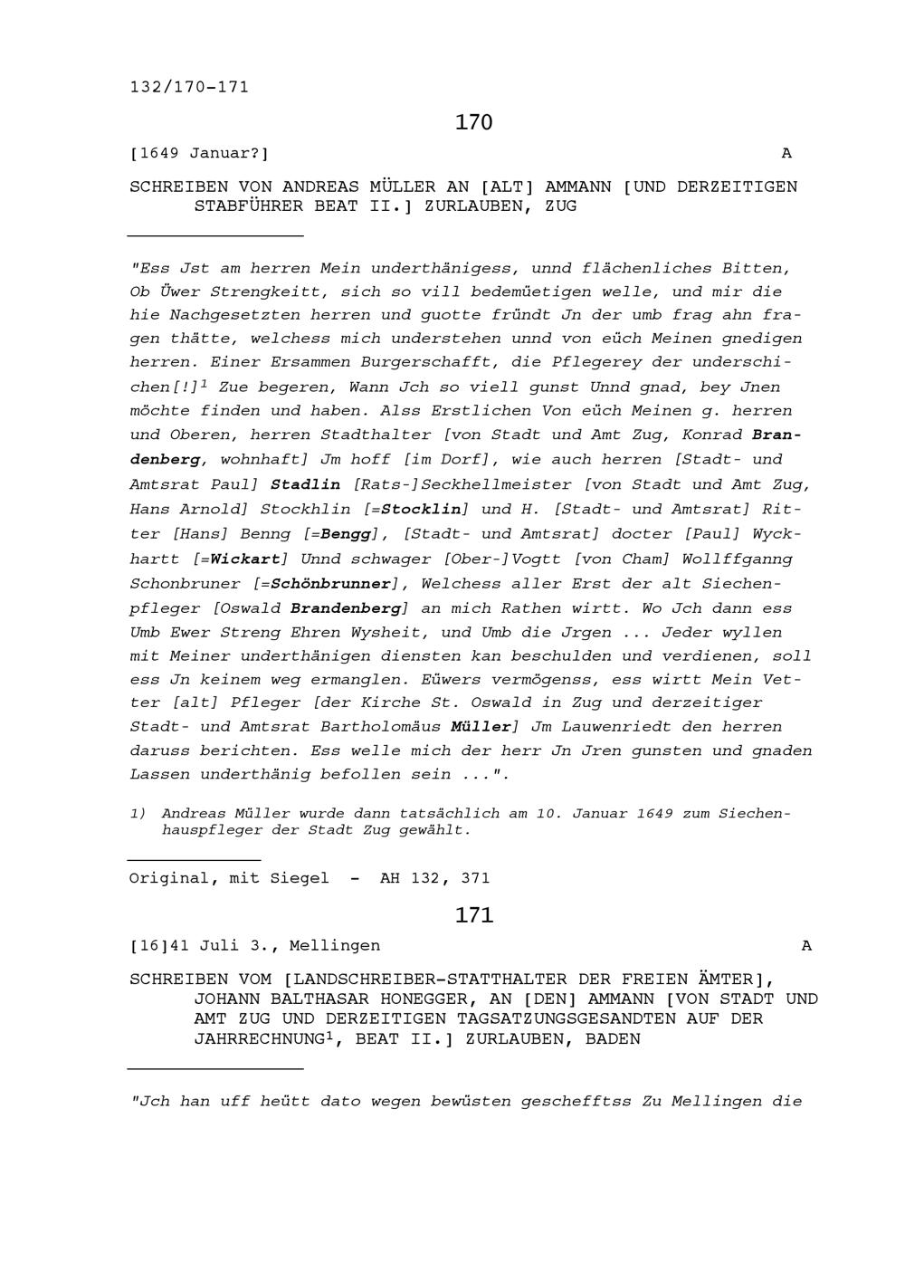 Schreiben von Johann Balthasar Honegger, Landschreiberstatthalter der Freien Ämter, an Beat II. Zurlauben, Ammann von Stadt und Amt Zug und Tagsatzungsgesandter auf der Jahrrechnung, Baden