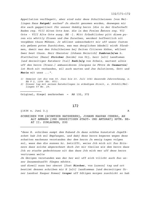Schreiben von Johann Balthasar Honegger, Landschreiberstatthalter der Freien Ämter, an Beat II. Zurlauben, Ammann von Stadt und Amt Zug und Tagsatzungsgesandter auf der Jahrrechnung, Baden