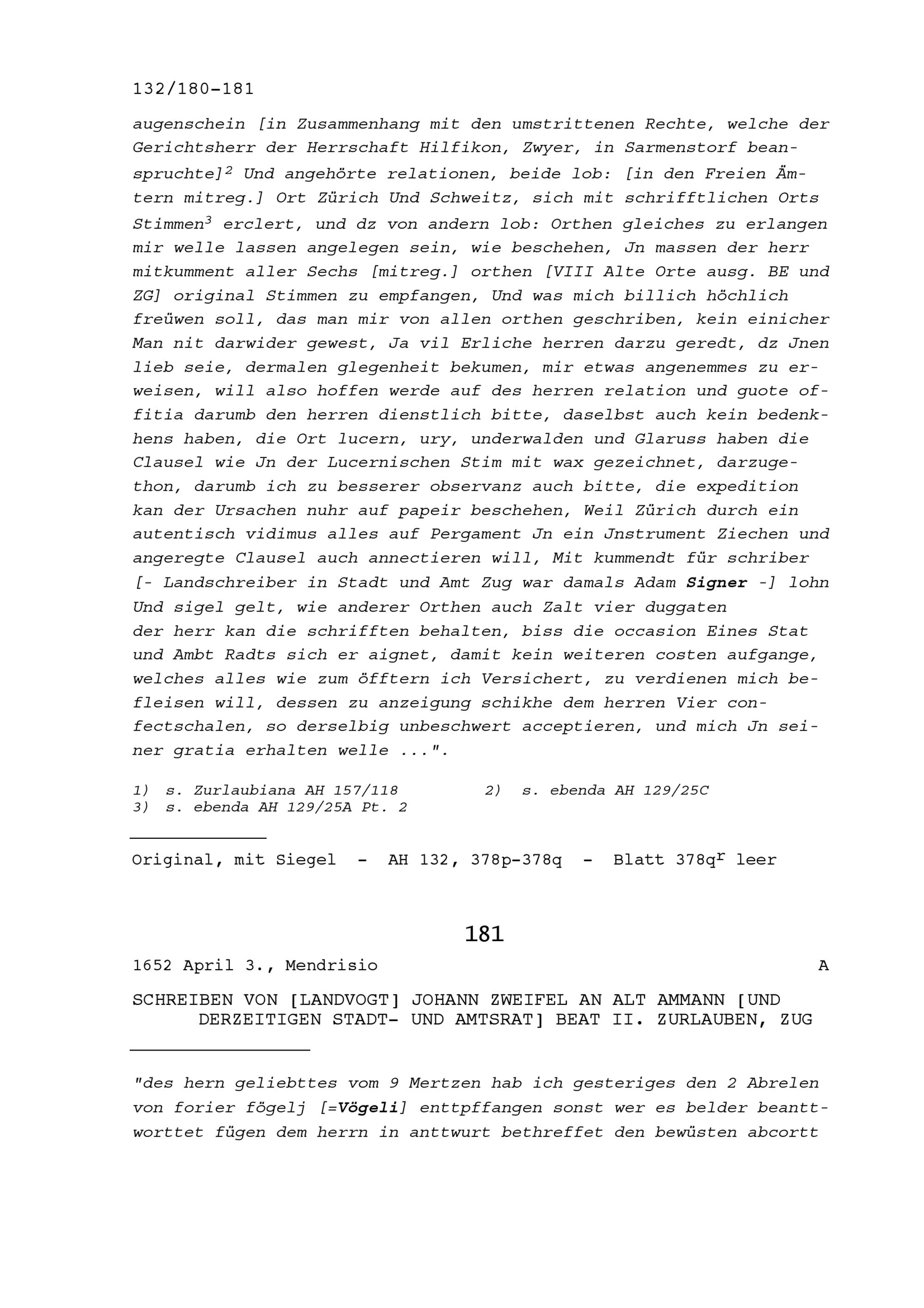 Schreiben von Sebastian Peregrin Zwyer, Landrat Uri, an Beat II. Zurlauben, Altammann...