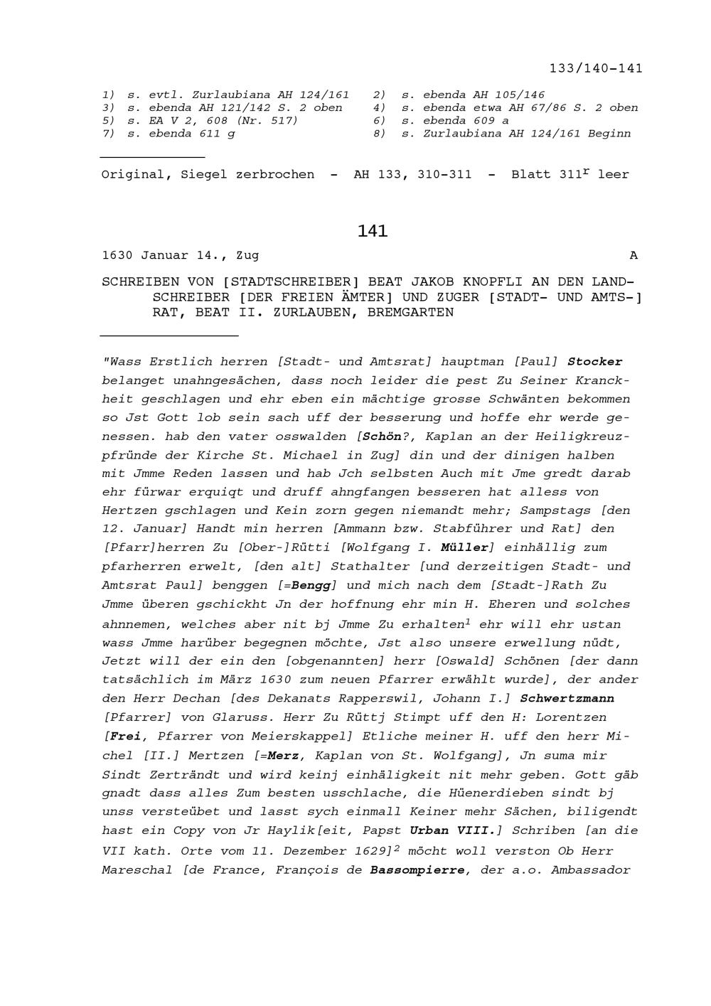 Schreiben von Beat Jakob Knopfli, Stadtschreiber, an Beat II. Zurlauben, Landschreiber...