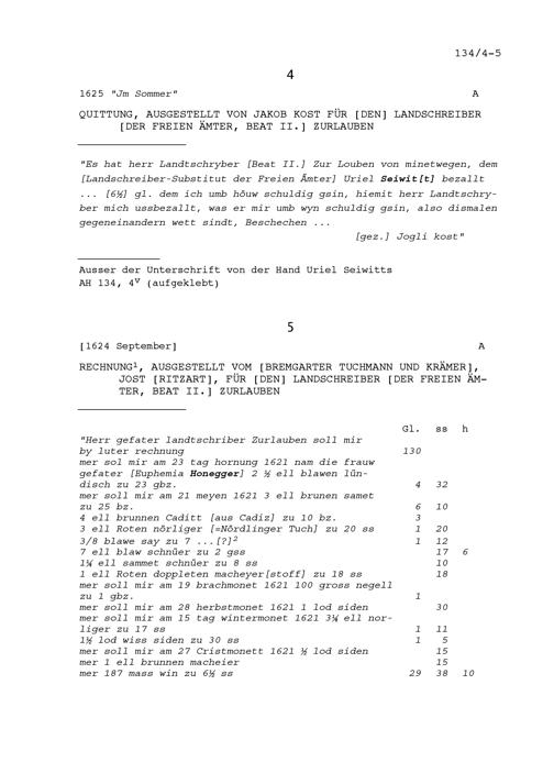 Rechnung für Beat II. Zurlauben, Landschreiber der Freien Ämter, ausgestellt von Jost Ritzart, Bremgarter Tuchmann und Krämer,