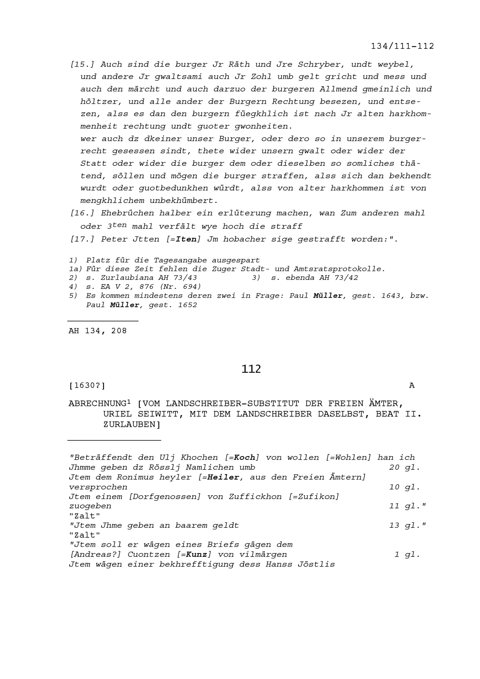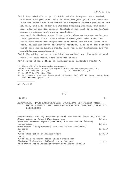 Notiz von Beat II. Zurlauben, Ammann von Stadt und Amt Zug, über die Sitzung des Stadt- und Amtrats vom 20. Januar 1635