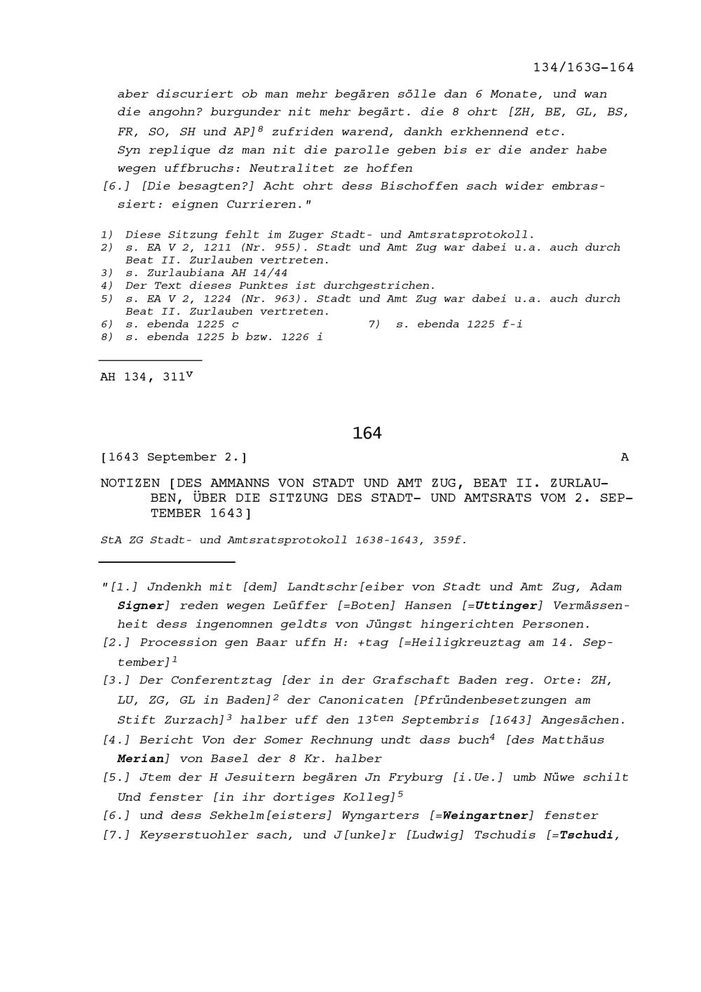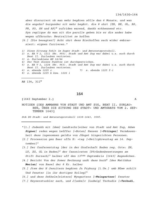 Notiz von Beat II. Zurlauben, Ammann von Stadt und Amt Zug, über die Sitzung des...