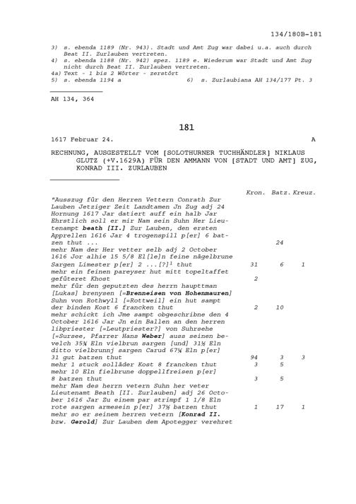 Notiz von Beat II. Zurlauben, Stabführer der Stadt Zug, über die Sitzung des Stadtrats vom 13. April 1641