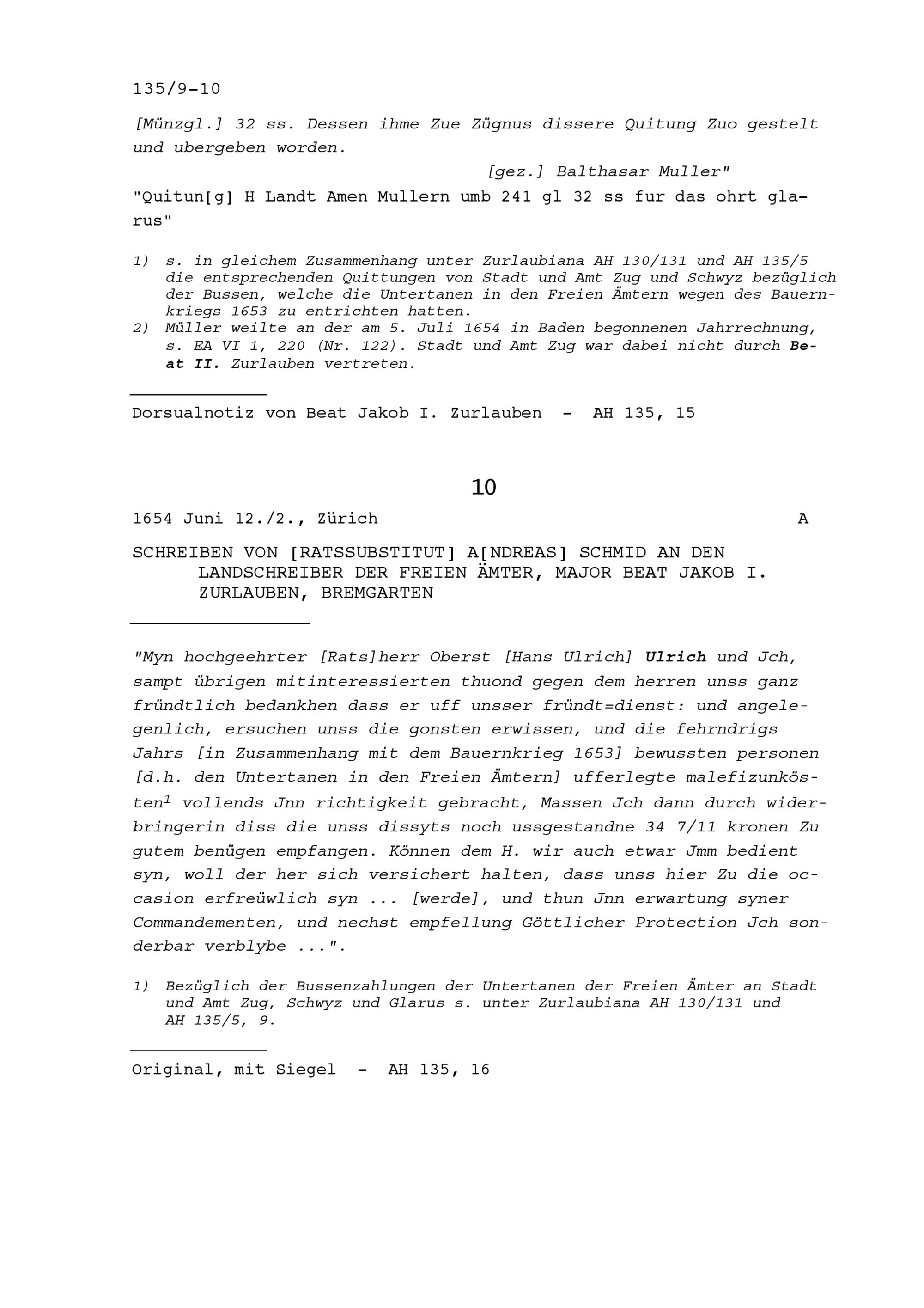 Quittung für Beat Jakob I. Zurlauben, Landschreiber der Freien Ämter, ausgestellt von Balthasar Müller, Landammann und Tagsatzungsgesandter von Glarus