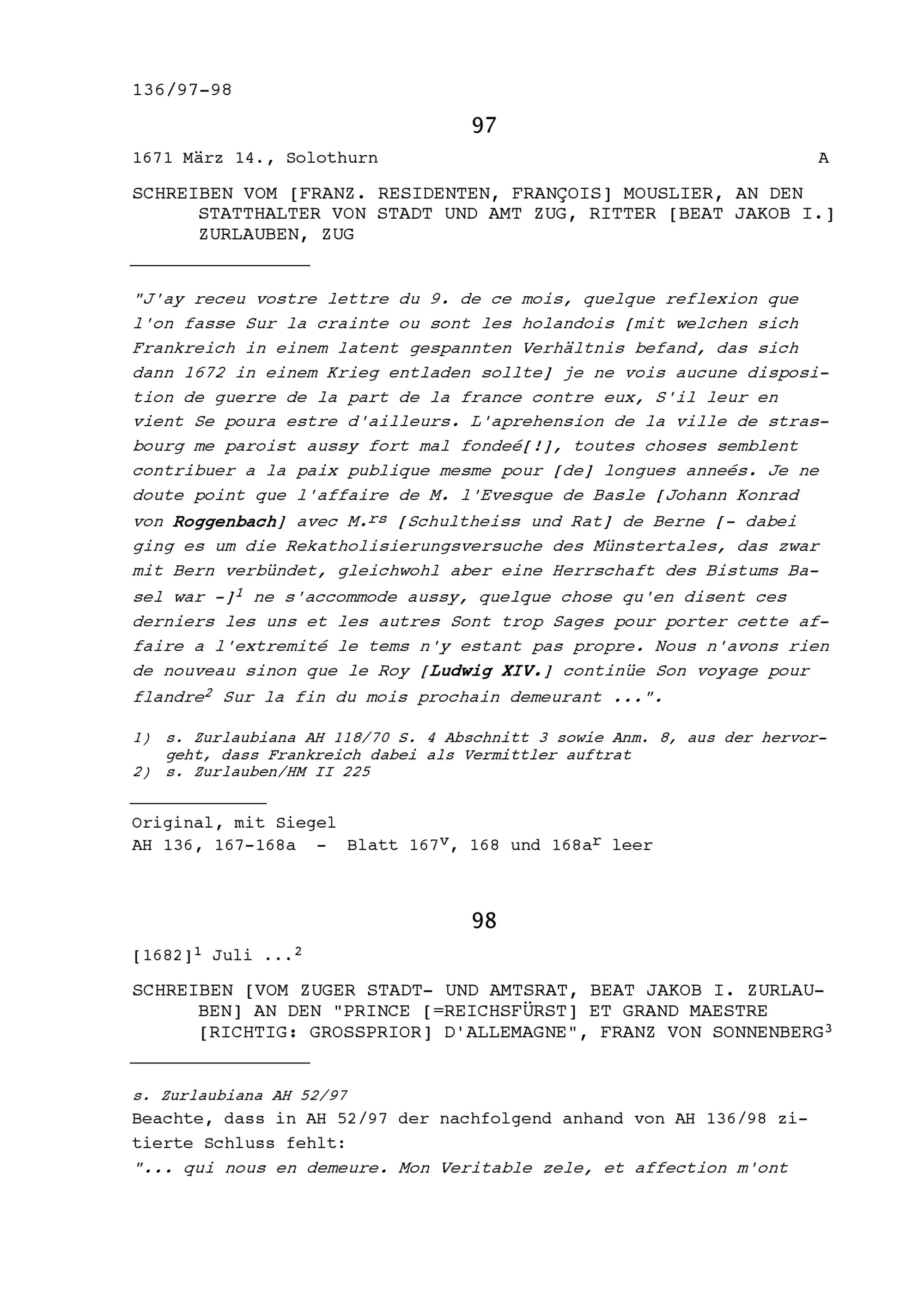 Schreiben von Beat Jakob I. Zurlauben, Stadt- und Amtrat Zug an Franz von Sonnenberg, Reichsfürst und Grossprior