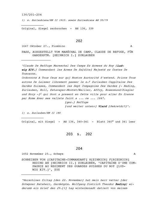 Schreiben von Heinrich Friedrich Reding, Kommandant, an Heinrich II. Zurlauben, Hauptmann einer Kompanie der Schweizer Garde, Zug