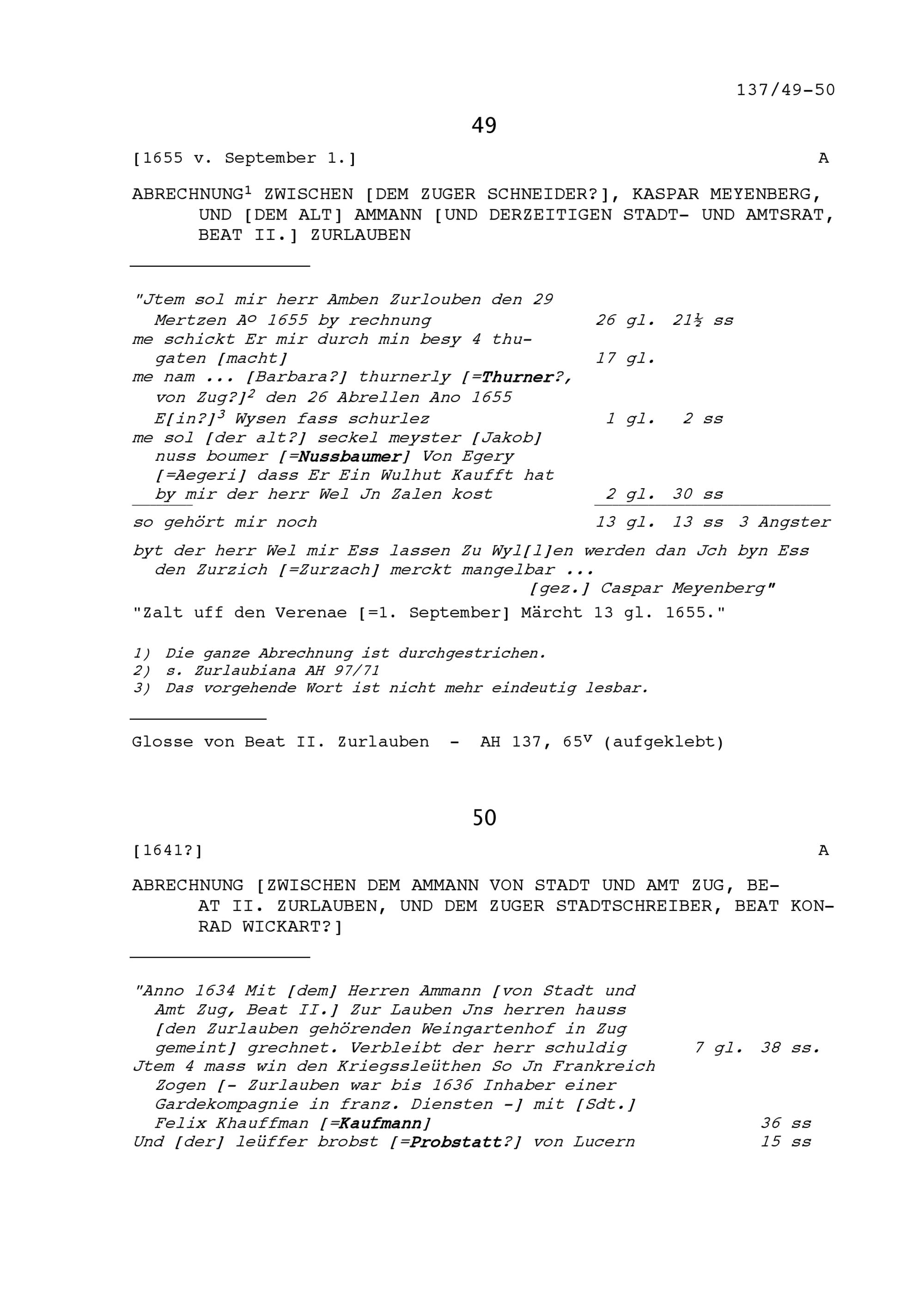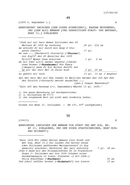 Abrechnung zwischen Beat II. Zurlauben, Ammann von Stadt und Amt Zug, und Beat Konrad Wickart, Zuger Stadtschreiber