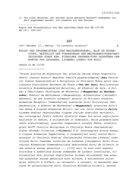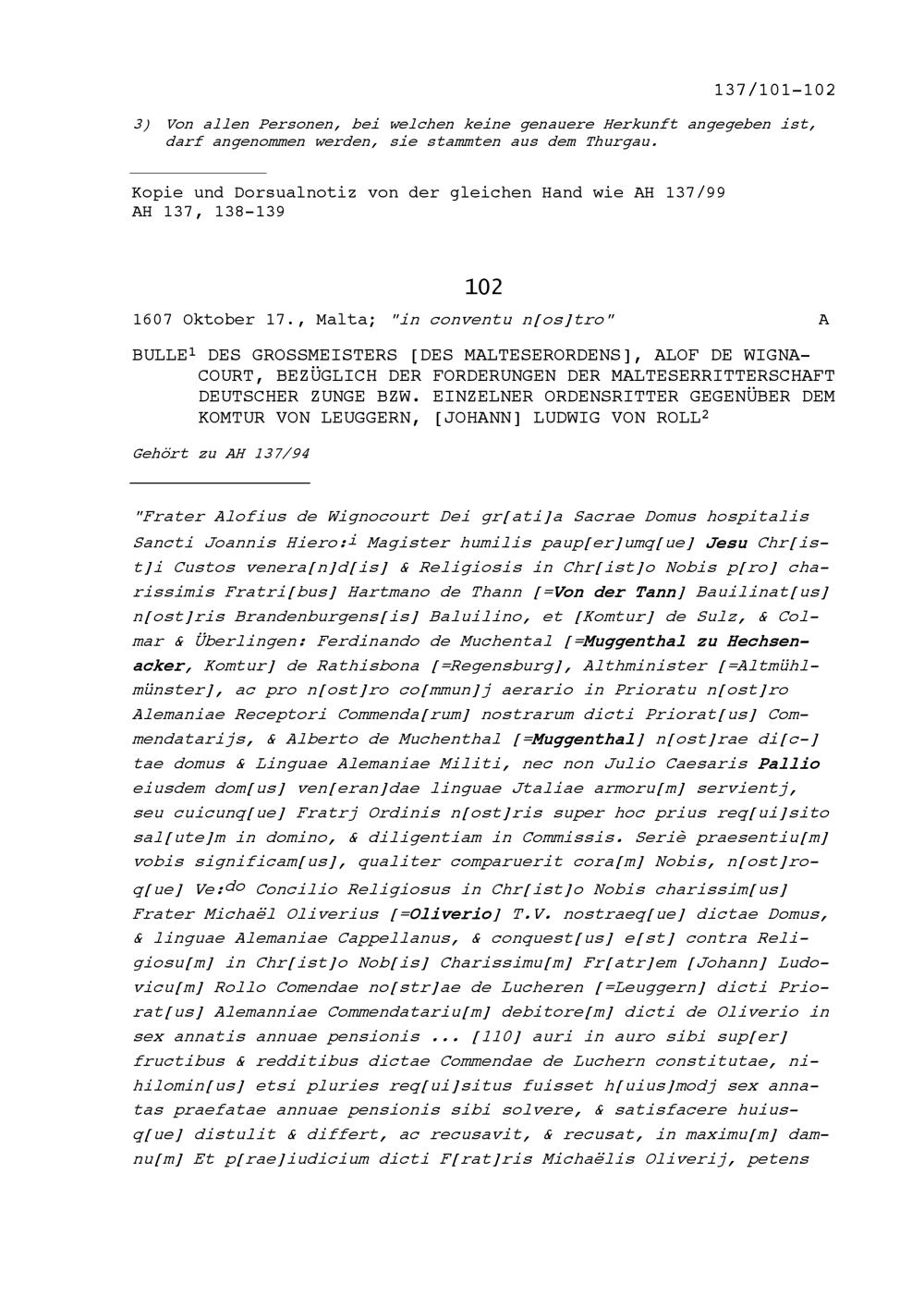 Notiz von Adam Heller, Vogt und Gerichtsschreiber von Tobel, betreffend der Restanzen von 2282 R 12 SS 2 D., die Johann Ludwig von Roll, Komtur von Leuggern, wegen der Kommende Tobel zu bezahlen hatte, am 19. März 1608 mir übergeben in Beisein von Hans Werner, Edler von Reitnau, Komtur von Feldkirch, von Johann Peter I. von Roll, Ritter und Bruder von Johann Ludwig für die Tobel Schuld, die Arbogast von Andlau, Grossprior der Malteserritterschaft deutscher Zungen, zugehörig, am 28. Oktober 1609