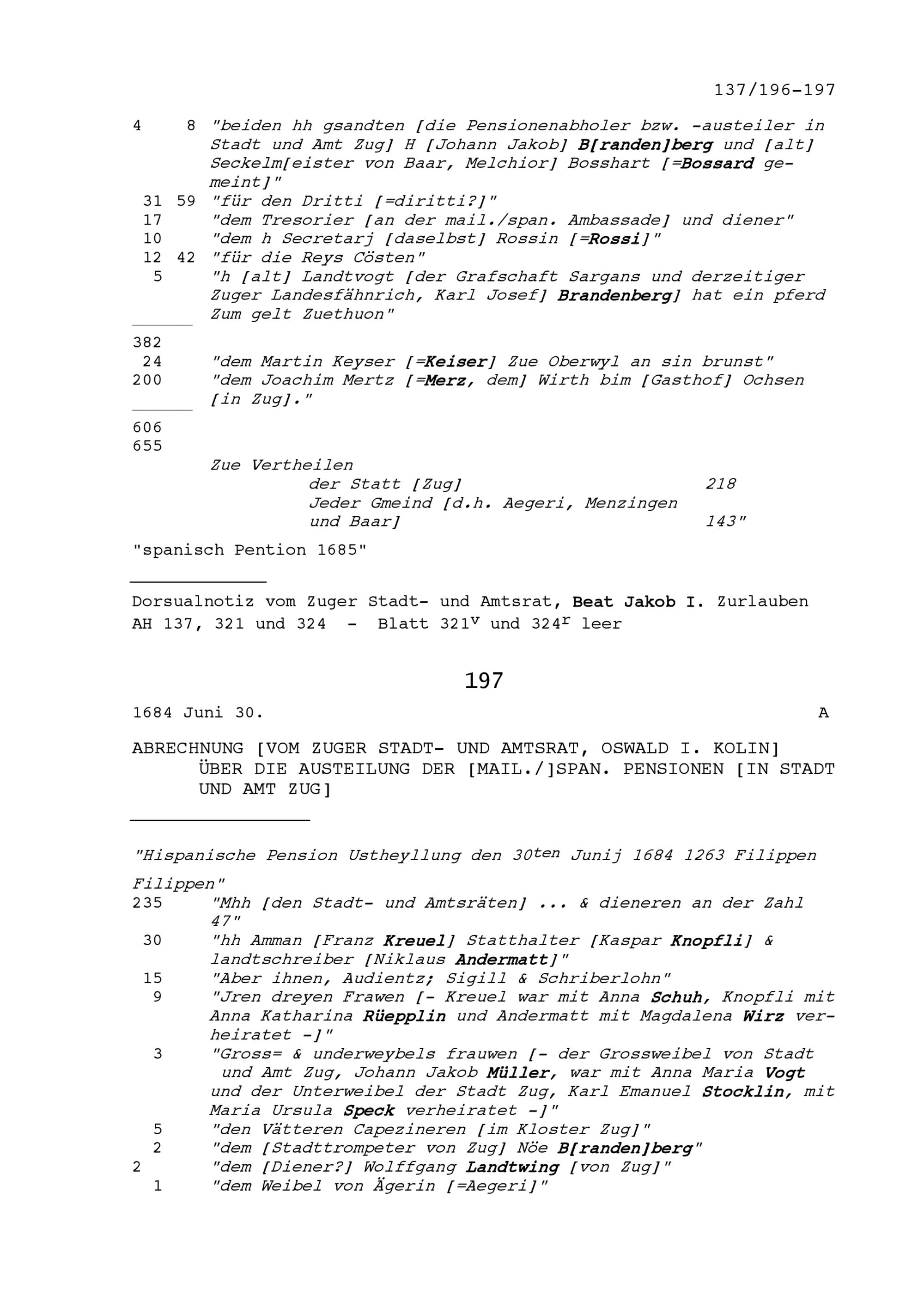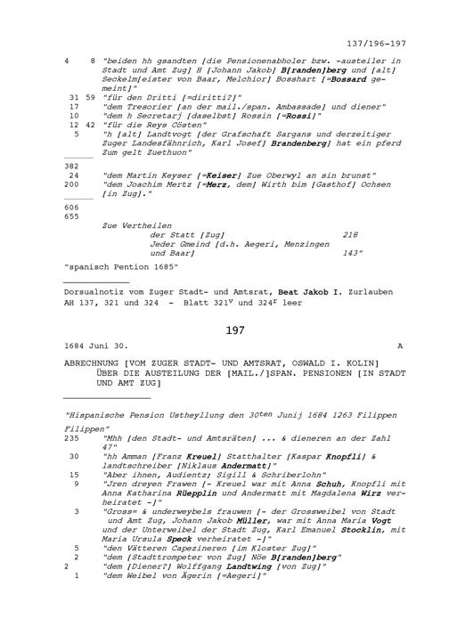 Abrechnung von Oswald I. Kolin, Stadt- und Amtrat Zug, über die Austeilung der mailändisch-spanischen Pensionen in Stadt und Amt Zug